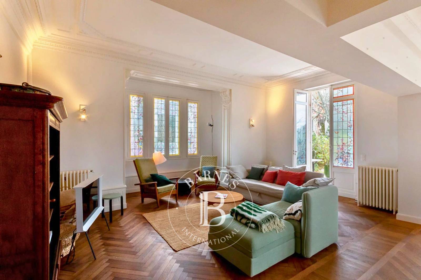 Rénové intégralement en 2016, ce bien de caractère développe environ 117 m² habitables. Dès l’entrée, vous découvrirez un séjour lumineux, sublimé par de grandes ouvertures donnant sur un jardin paysager privé, propice à la détente.