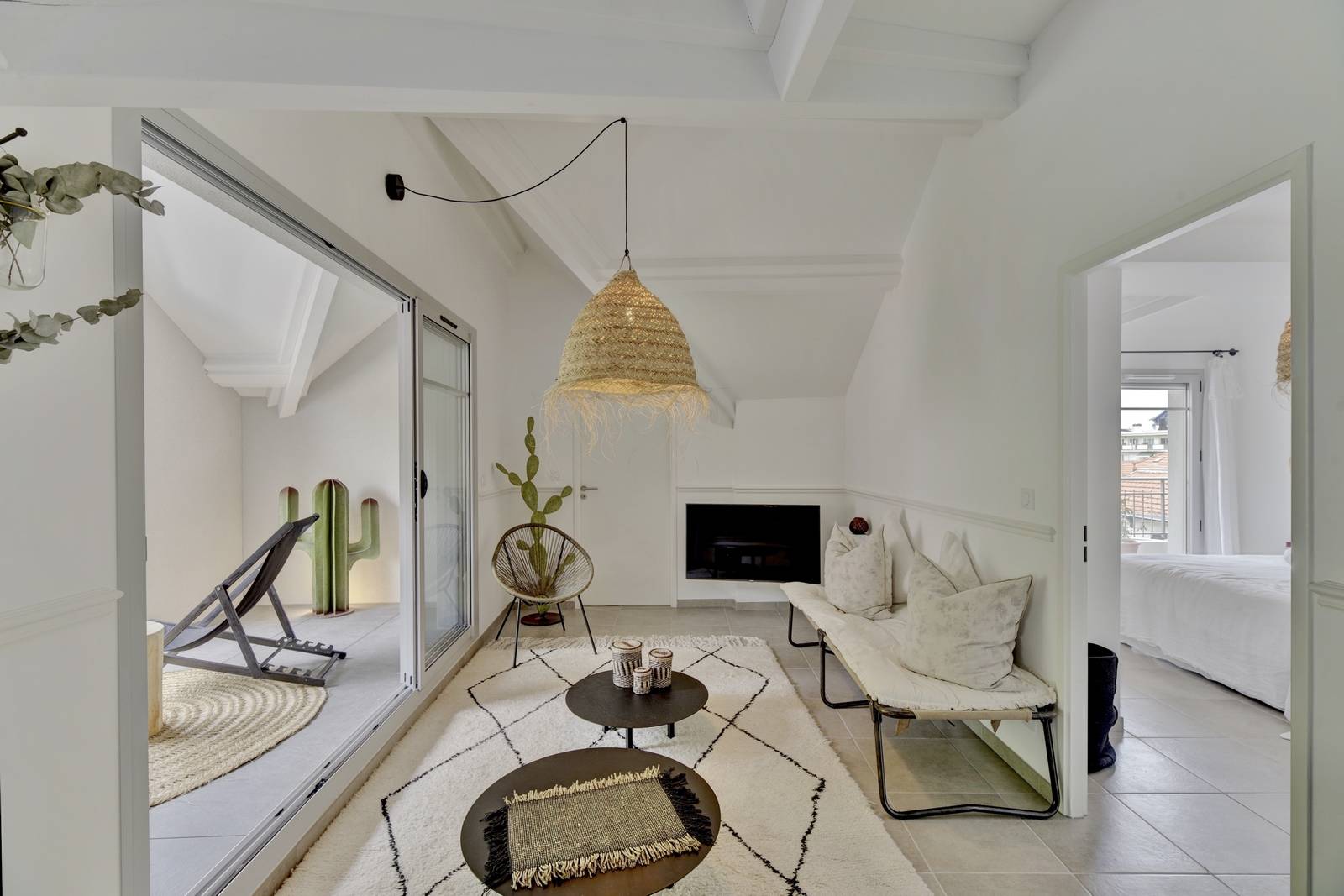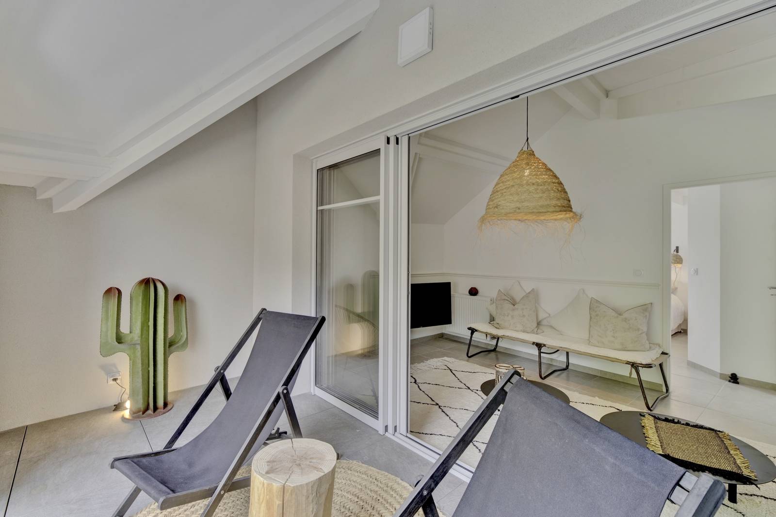 Cet appartement aux très belles prestations dispose de deux chambres avec salles d'eau, d'un séjour avec cuisine ouverte haut de gamme, d'une belle terrasse couverte, d'un balcon, de deux wc et d'une entrée séparée.