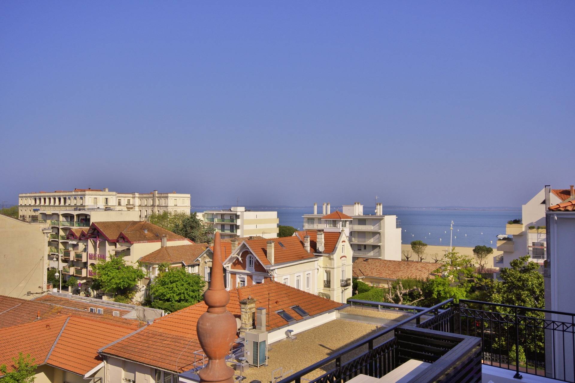 Situé dans l'hypercentre d'Arcachon, à proximité des commerces et de la plage, appartement de type 3 : cuisine indépendante, séjour, 2 chambres, 2 loggias, terrasse de 35 m2 sur le toit avec vue panoramique sur le Bassin d'Arcachon.