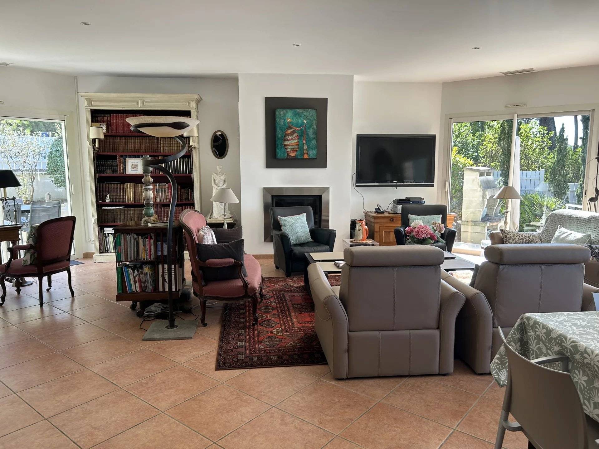 Dès l'entrée, un vaste séjour baigné de lumière, agrémenté d'une cheminée, s'ouvre vers le sud-ouest, offrant un accès direct à une terrasse ensoleillée qui surplombe une somptueuse piscine chauffée de 50 m². Une cuisine fermée et entièrement équipée complète cet espace convivial.