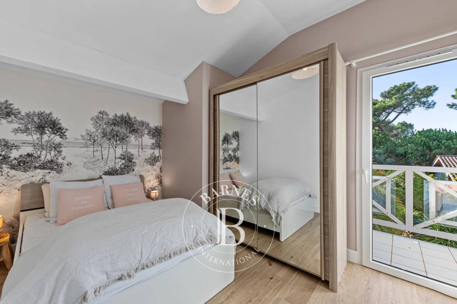À l'étage, trois chambres spacieuses, dont deux avec accès à une terrasse commune offrant une vue sur le Bassin. Une autre salle d'eau vient compléter ce niveau.