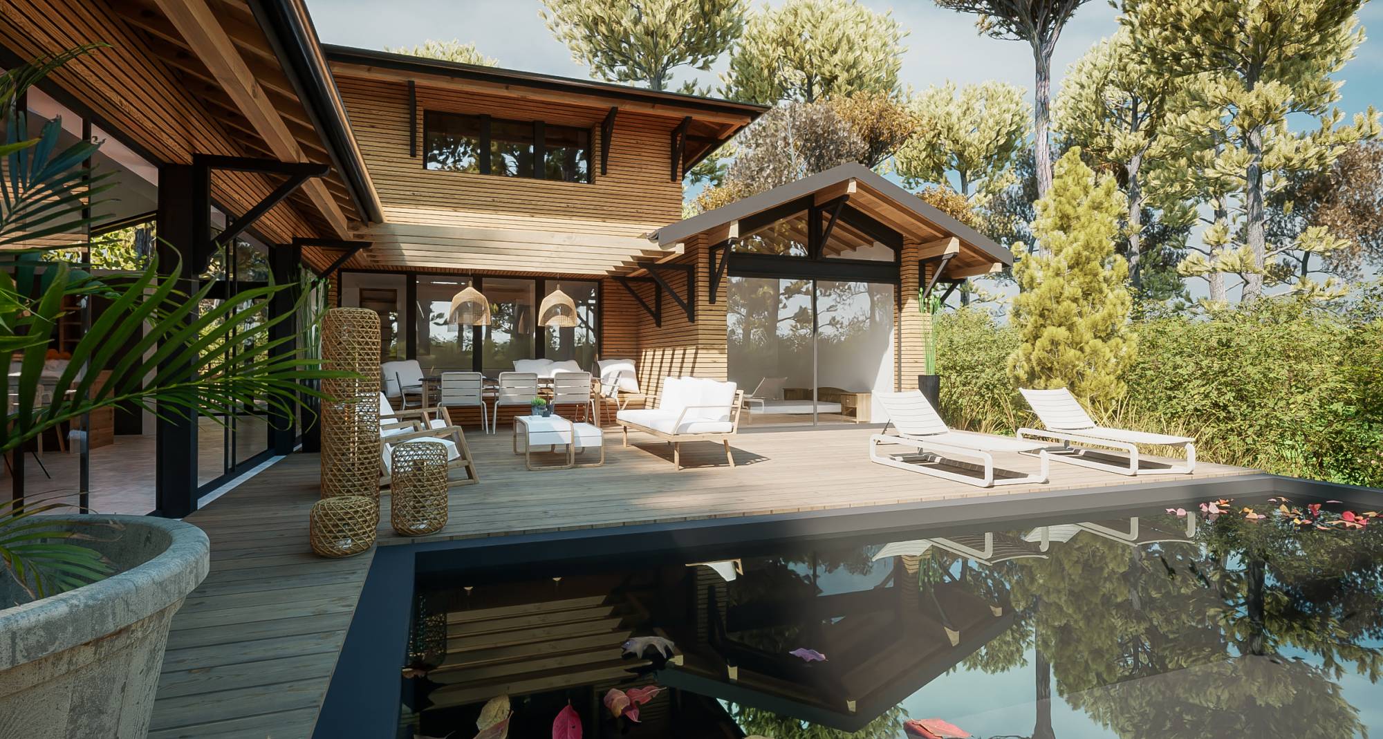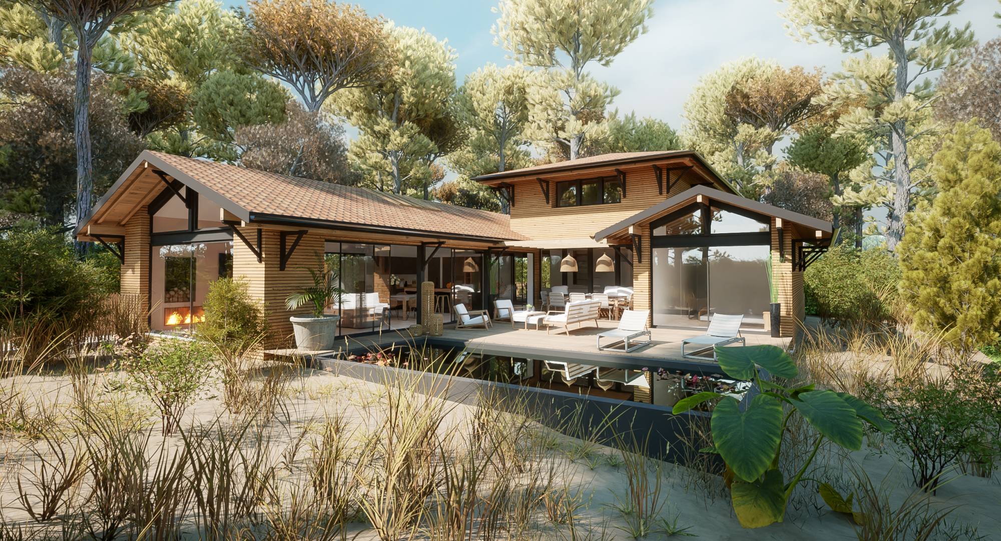 Sur les hauteurs du Moulleau, secteur Pyla sur mer, terrain boisé plat et piscinable de 790 m2 avec superbe projet de construction d'une villa d'architecte de plus de 300 m2 avec piscine.