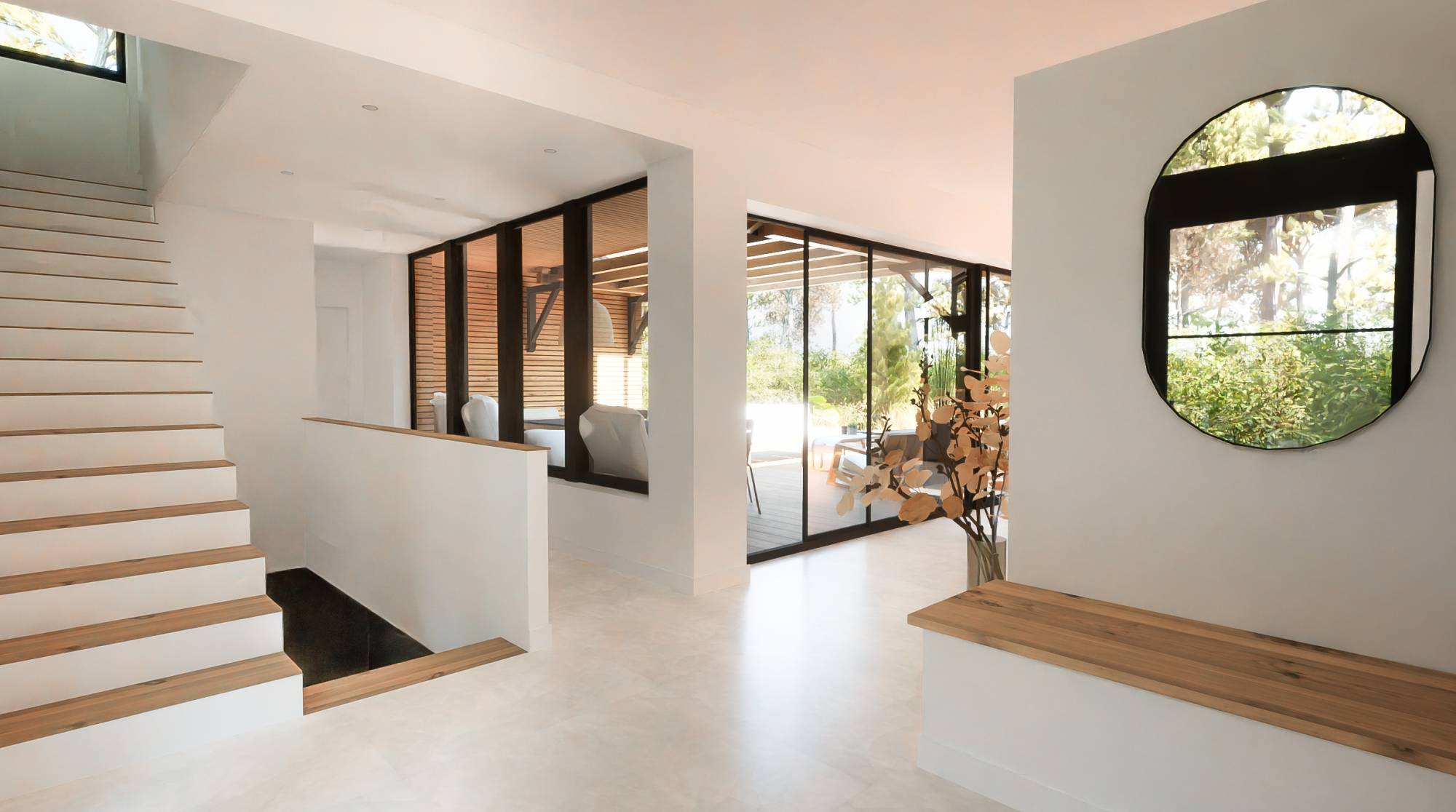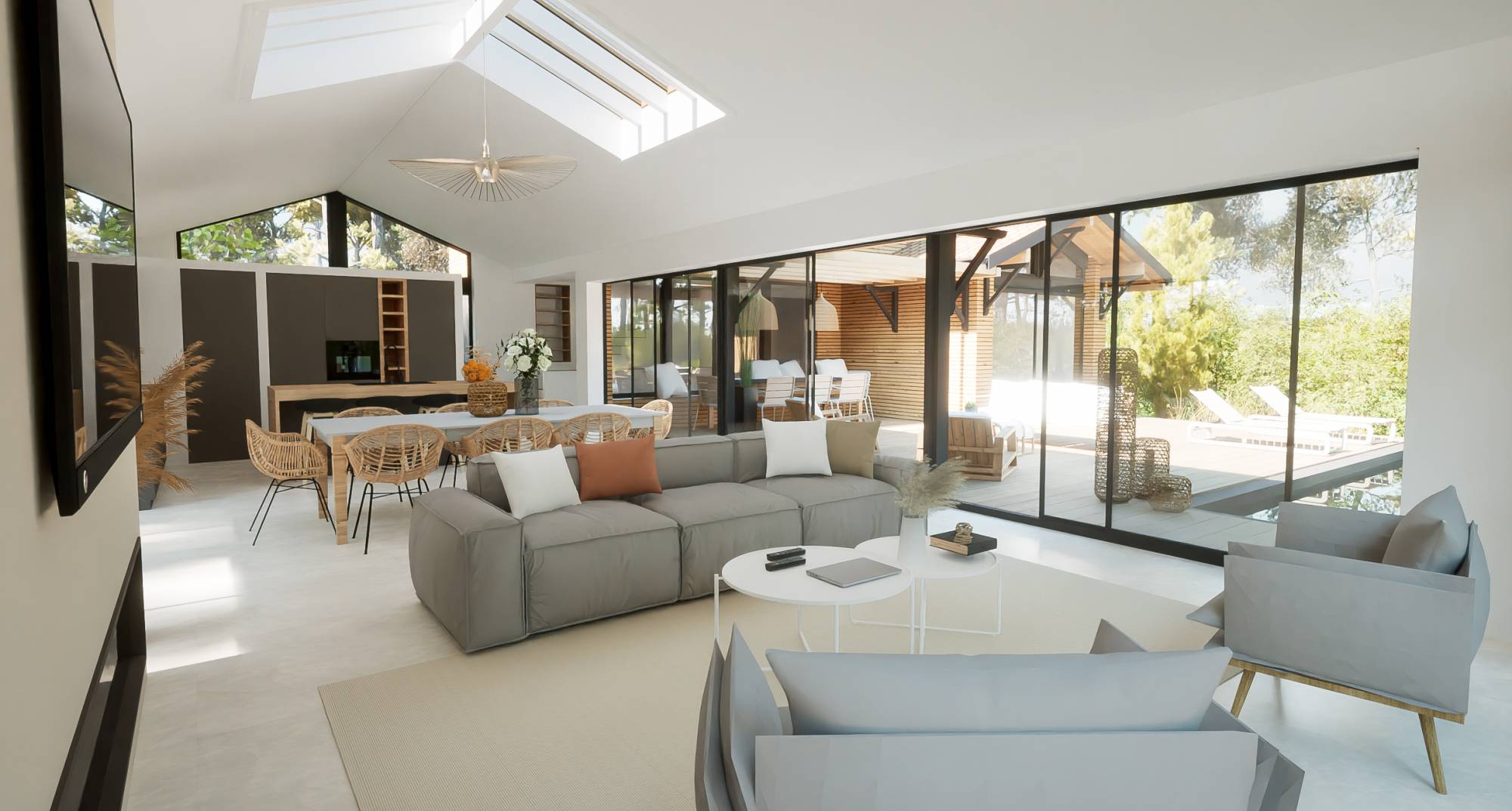 Beaucoup de luminosité amenée par les larges baies et la verrière.