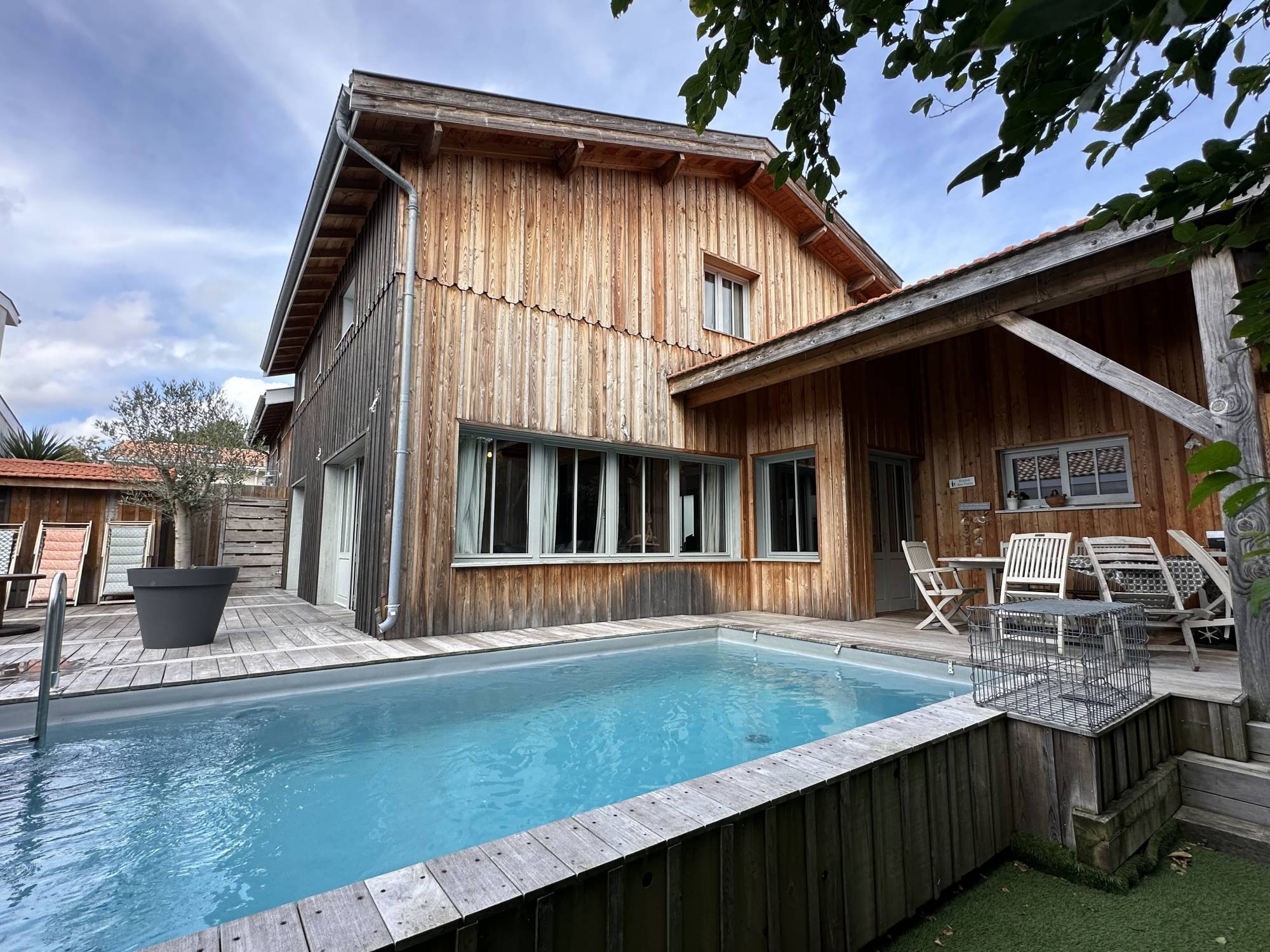 La seconde villa, de plus de 130 m², bardée de douglas, s'inspire du style du bassin avec ses beaux planchers en pin et ses charpentes apparentes. Elle comprend une entrée, un salon-séjour ouvert sur une terrasse en ipé avec piscine en toile de fond, une cuisine équipée ouverte avec grand cellier communiquant, une chambre avec salle d’eau et des toilettes invités au même niveau. À l’étage, une belle mezzanine pouvant servir de couchage ou de bureau, deux chambres se partageant une salle d’eau et un toilette indépendant.