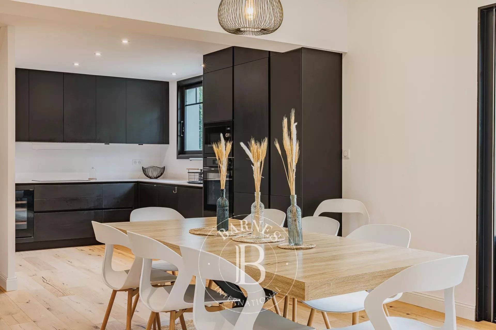 Cette demeure de 8 pièces, entièrement rénovée avec des matériaux haut de gamme, offre un séjour cathédrale traversant avec cheminée, baigné de lumière grâce à ses baies à galandage ouvrant sur le jardin et l'espace repas extérieur. La cuisine ouverte, aménagée et équipée avec un grand plan de travail, se prolonge par une élégante salle à manger.