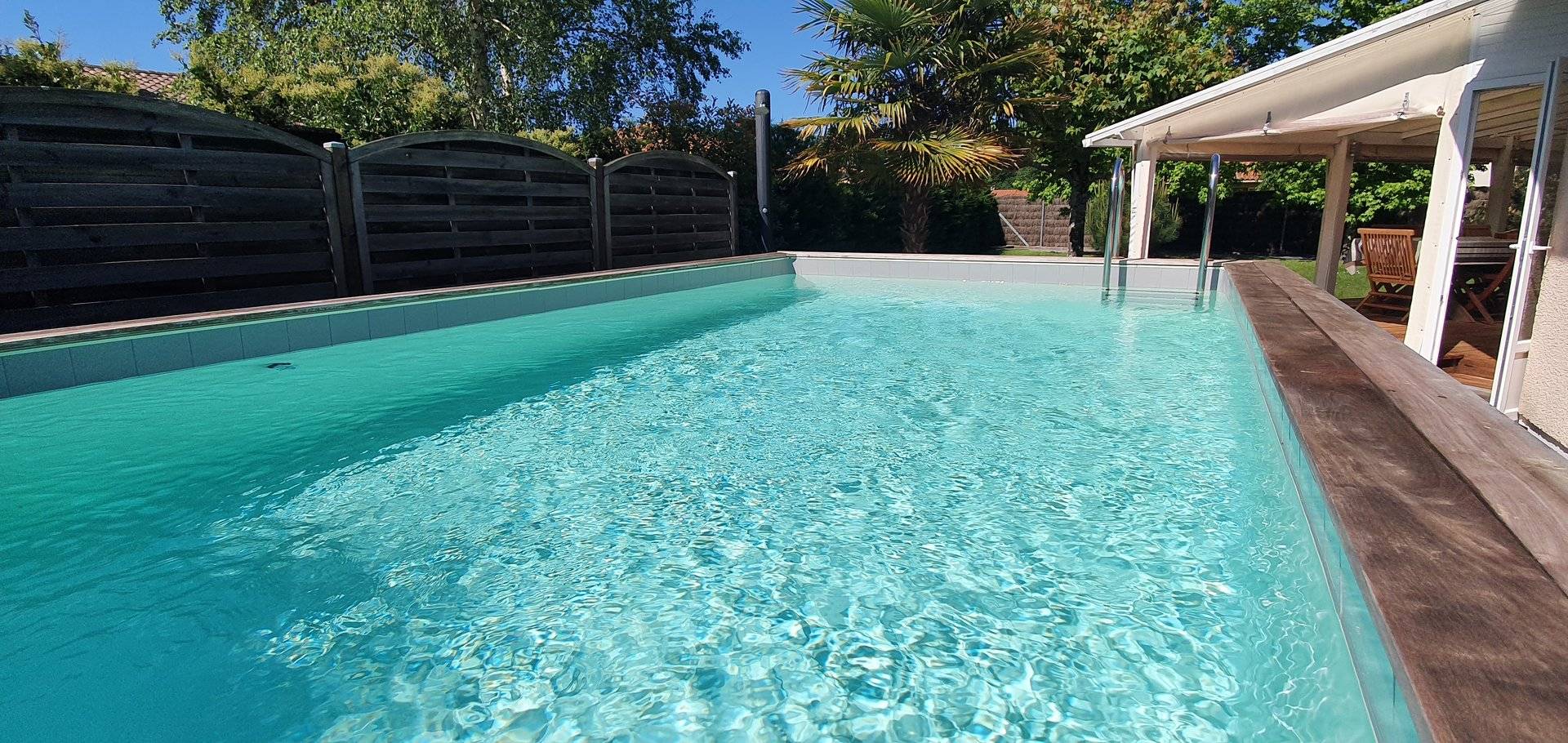 Superbe terrasse couverte, joli bar d'extérieur avec également sa terrasse, boulodrome, belle piscine hors sol chauffée et bardée de bois.