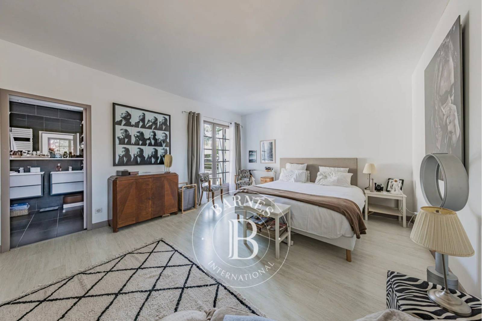 Sur le même niveau, la suite parentale bénéficie d’une salle de bains complète (douche et baignoire) et de nombreux rangements. Deux autres chambres se partagent une salle d’eau, ainsi qu’un bureau offrant un espace de travail confortable.
