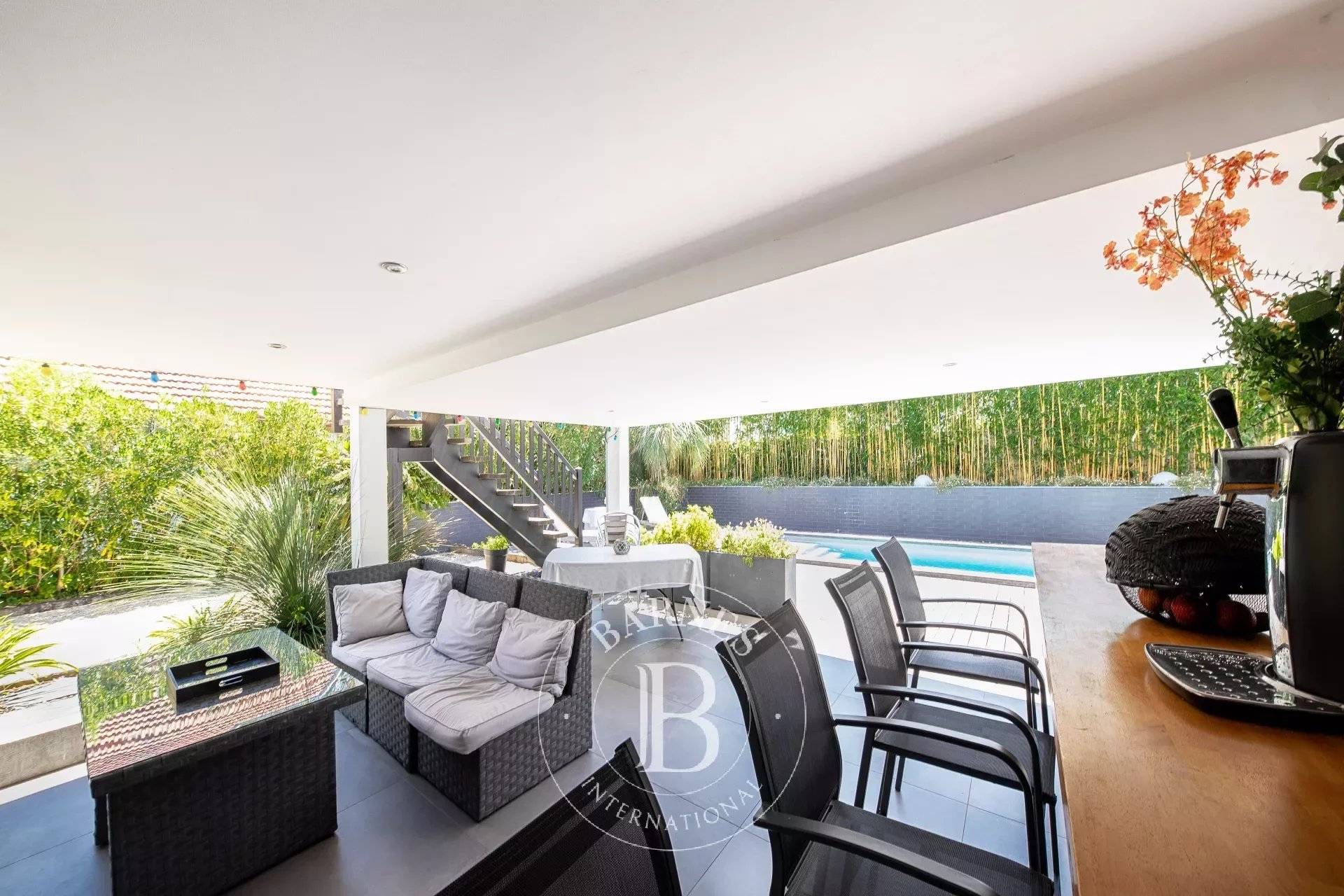 À l’extérieur, une grande piscine borde une élégante terrasse en bois. Une partie de cette terrasse est couverte, abritant une cuisine d’été entièrement équipée ainsi qu’un coin lounge/repas. Un boulodrome et un terrain de basket viennent compléter cet espace dédié aux loisirs.