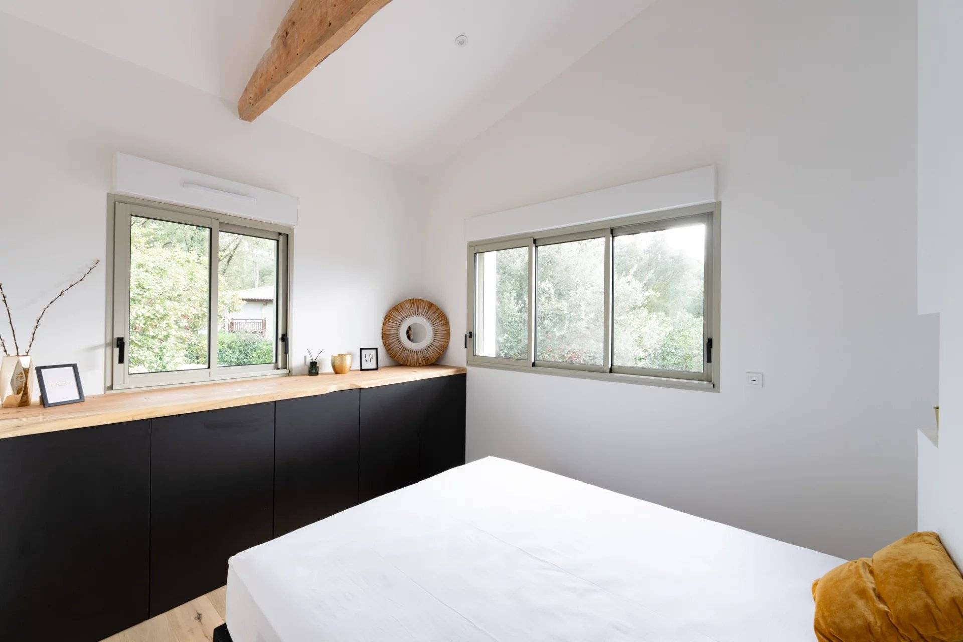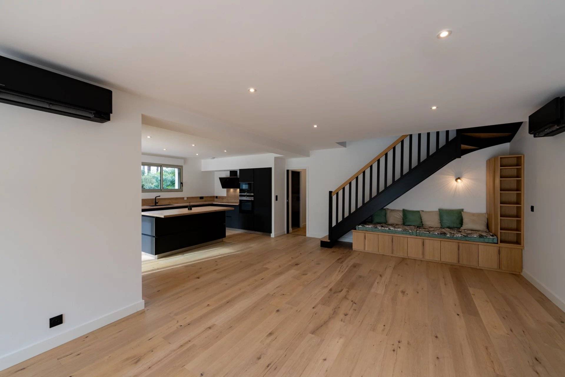 La pièce de vie spacieuse de 55 m² s'ouvre généreusement sur l'extérieur grâce à de grandes baies vitrées coulissantes. La cuisine américaine, à la fois fonctionnelle et équipée, est agrémentée d'un îlot central. L'espace nuit comprend deux chambres ou une grande suite parentale, ainsi qu'une salle d'eau avec wc. Des toilettes invités sont à disposition, ainsi qu'une buanderie et un cellier.