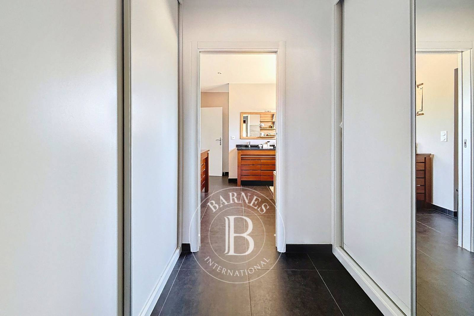 La villa principale compte quatre chambres, chacune avec sa salle d’eau. Une suite parentale dispose d’une salle de bains avec baignoire et douche. Un bureau de 15 m² complète l’agencement.