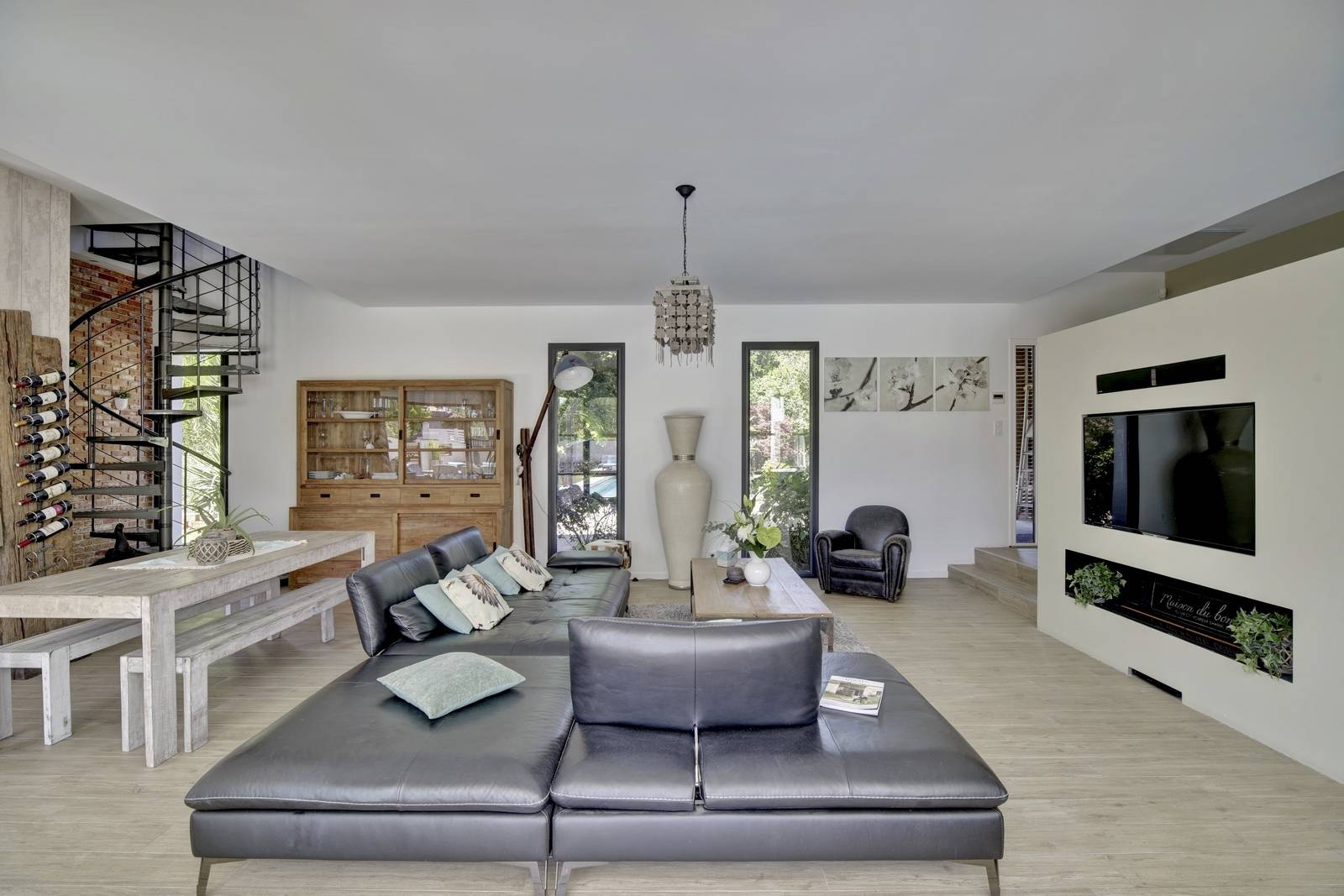 Vaste pièce de vie de 90 m2 avec cuisine équipée ouvrant sur la terrasse bio climatique et la piscine plein sud.