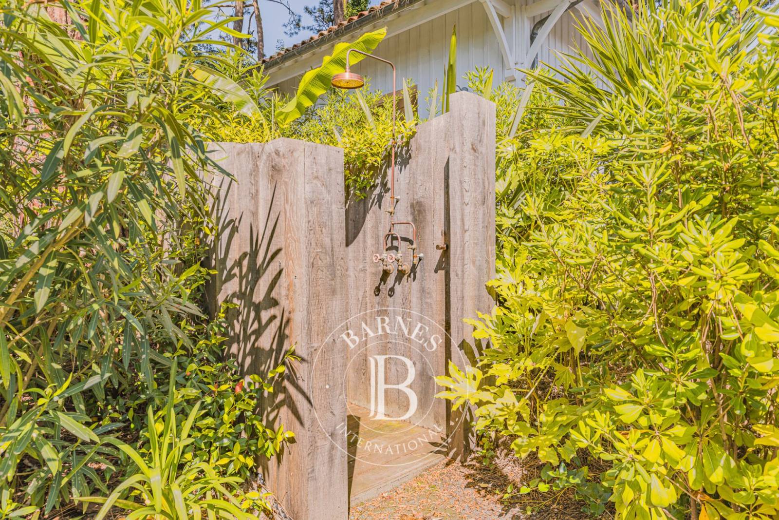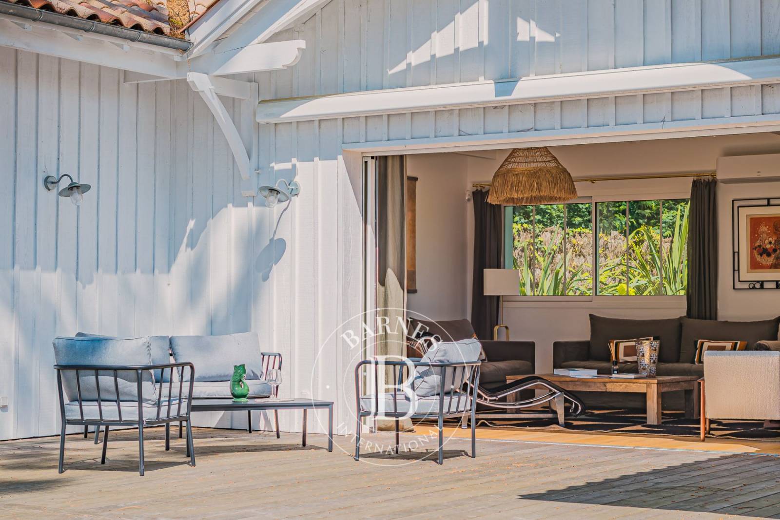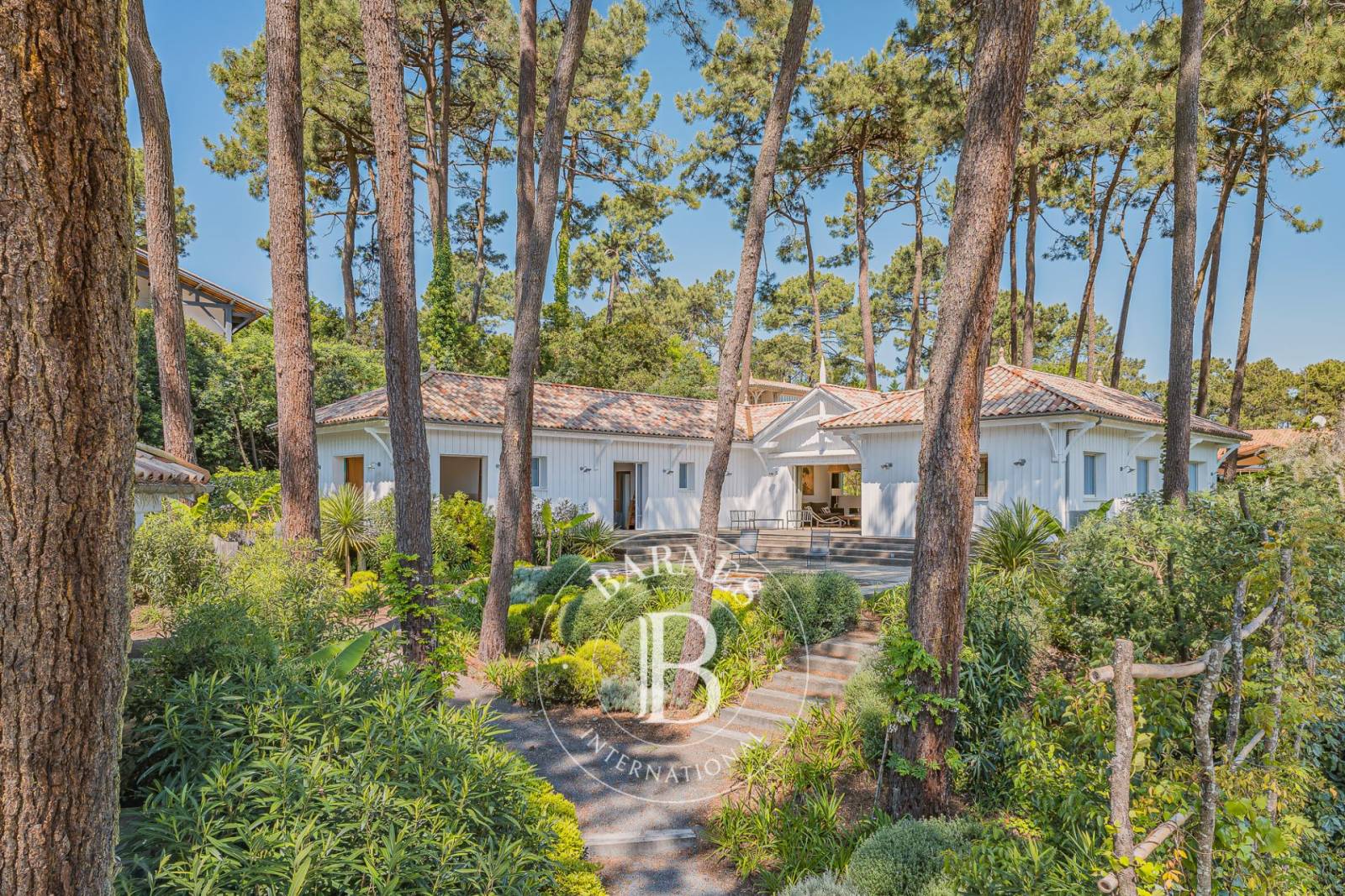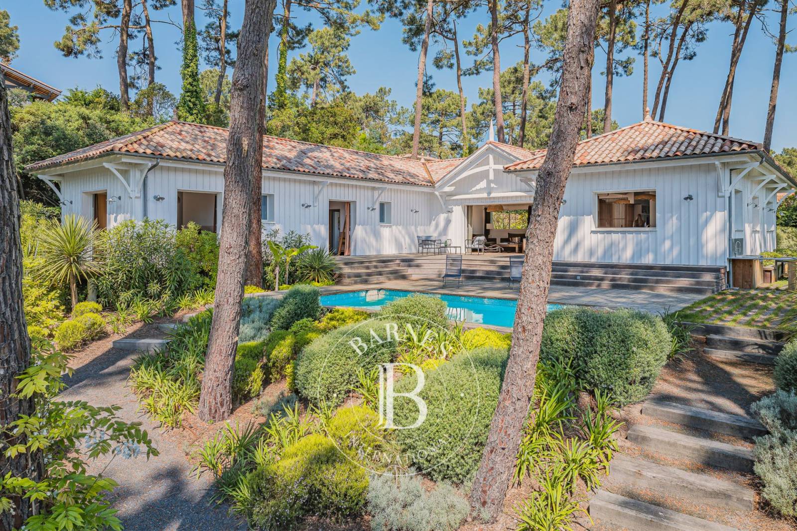 À l’extérieur, le jardin paysager, soigneusement aménagé, propose plusieurs lieux de vie : piscine, douche extérieure, brasero, terrain de pétanque et garage composent un ensemble parfaitement intégré à son environnement naturel. Une belle vue sur la pinède renforce l’atmosphère paisible et exclusive du lieu.
