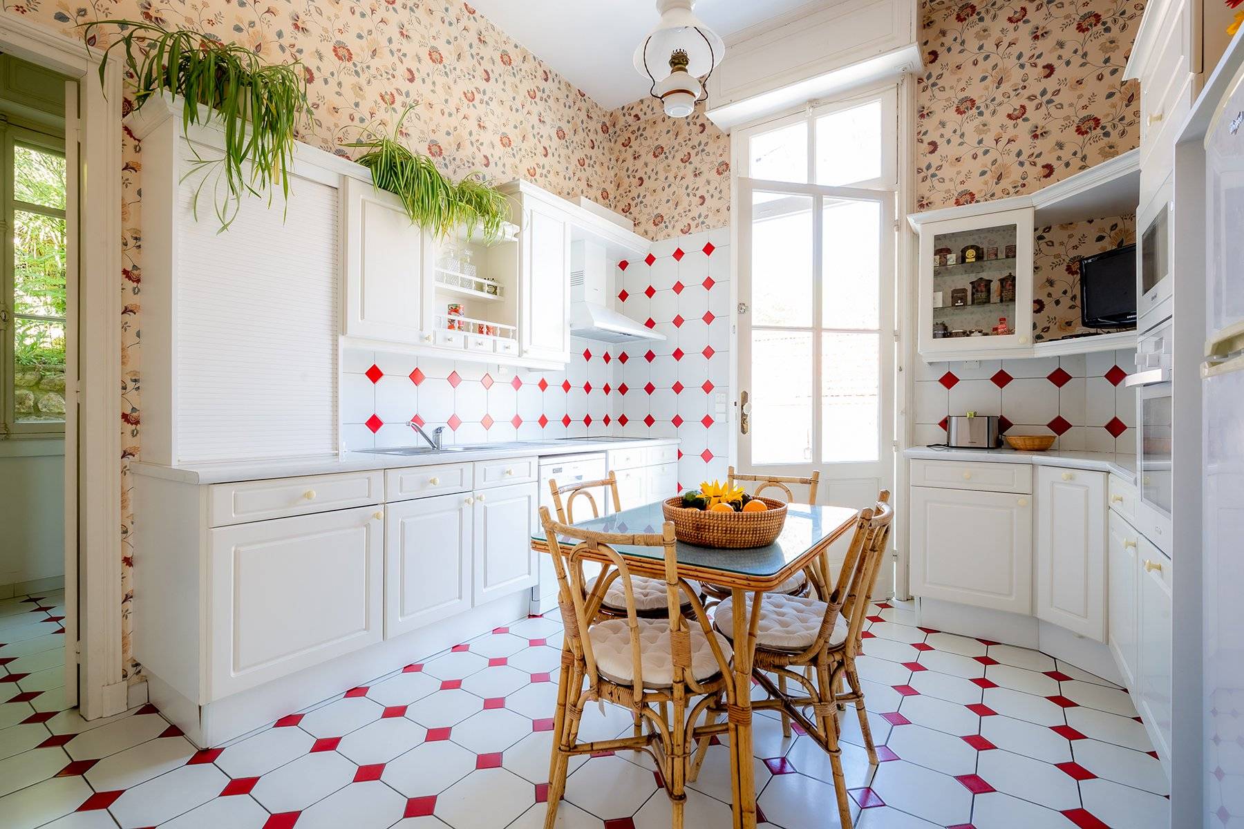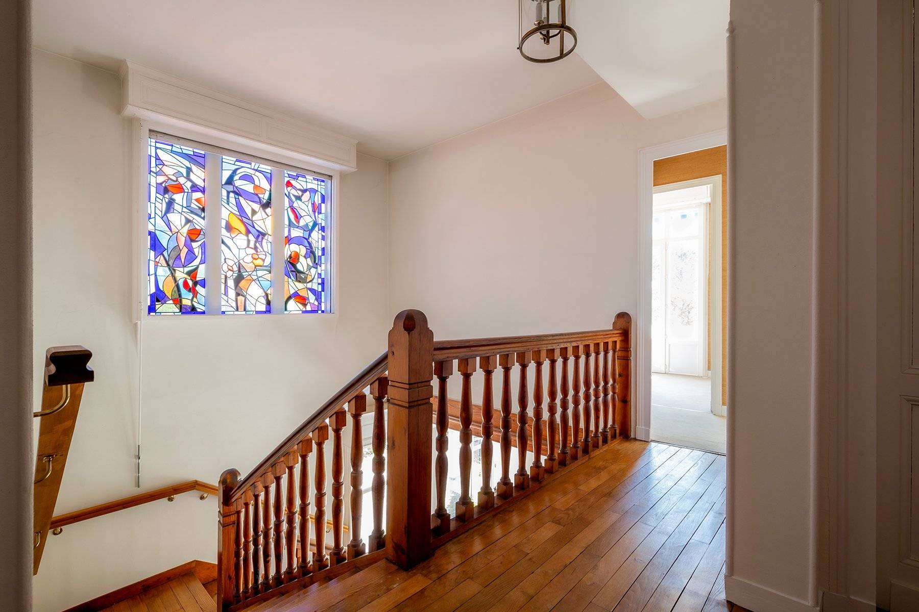 Le vaste hall d'entrée a conservé les éléments d'architecture d'origine (vitraux, cheminées, escalier, parquets et carrelages...).