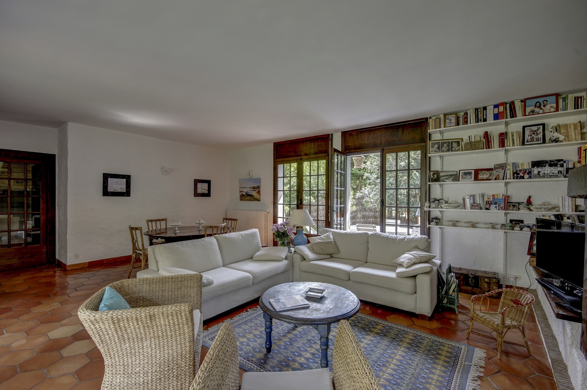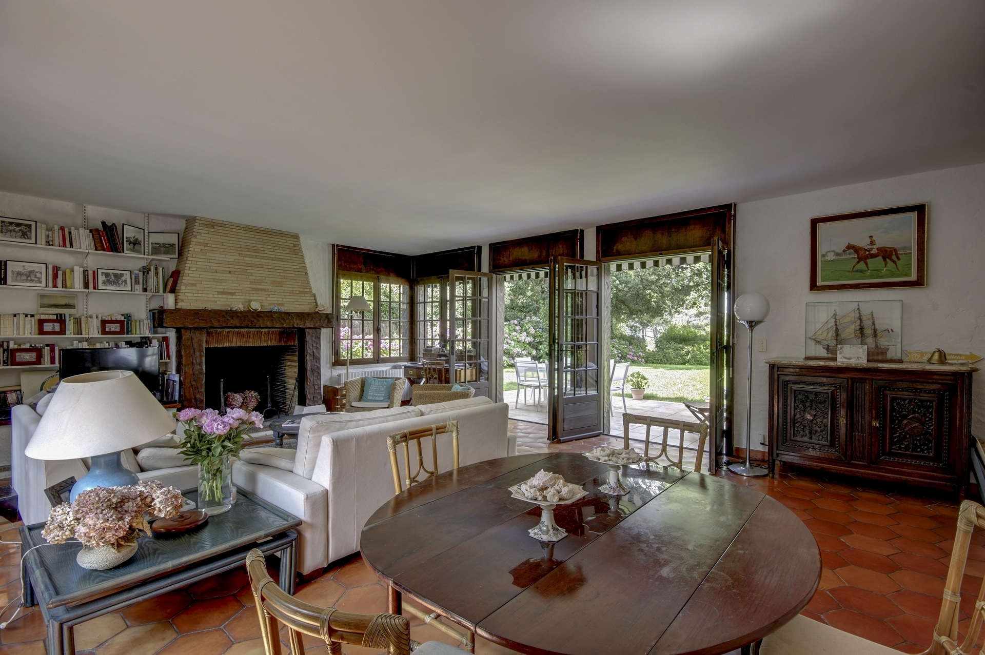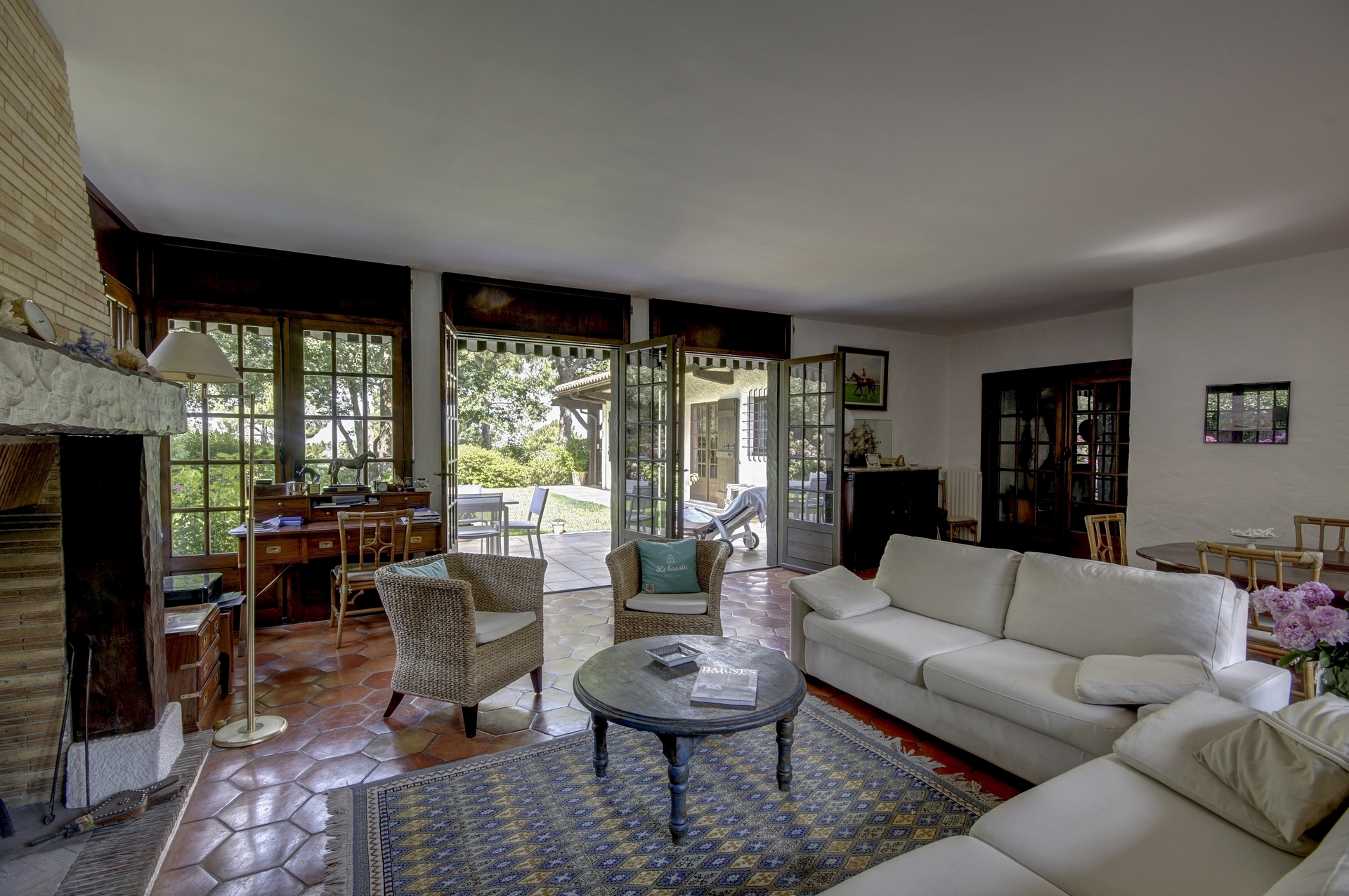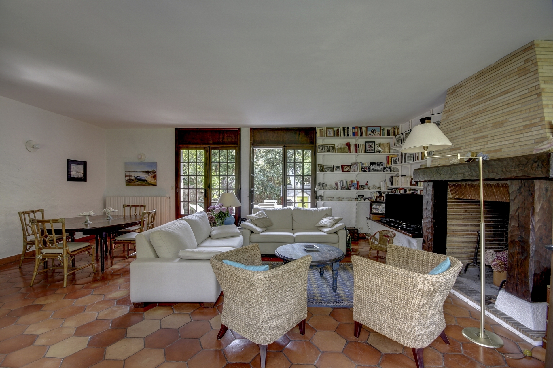 Cuisine fermée, grand séjour lumineux avec cheminée