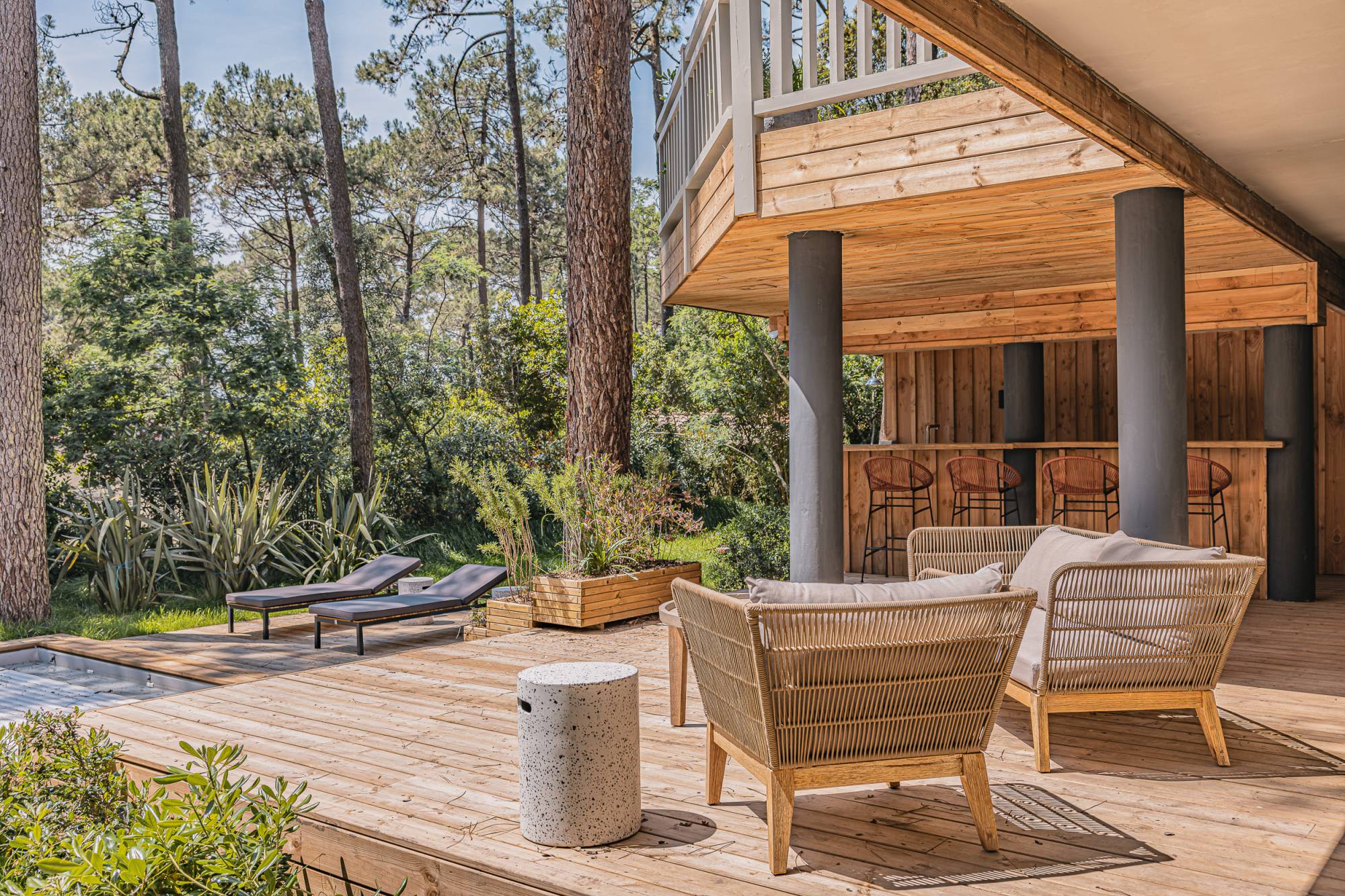 Cette villa de style ferret-capien, construite avec des matériaux haut de gamme et décorée avec soin, offre un cadre de vie raffiné. La pièce de vie, aux belles hauteurs sous plafond, s'organise autour de la cuisine ouverte et de la cheminée, créant un espace chaleureux en hiver. La terrasse attenante permet de profiter d'un panorama sur les pins et sur la piscine en contrebas. Deux généreuses suites parentales, chacune avec leur salle d'eau, complètent ce niveau.