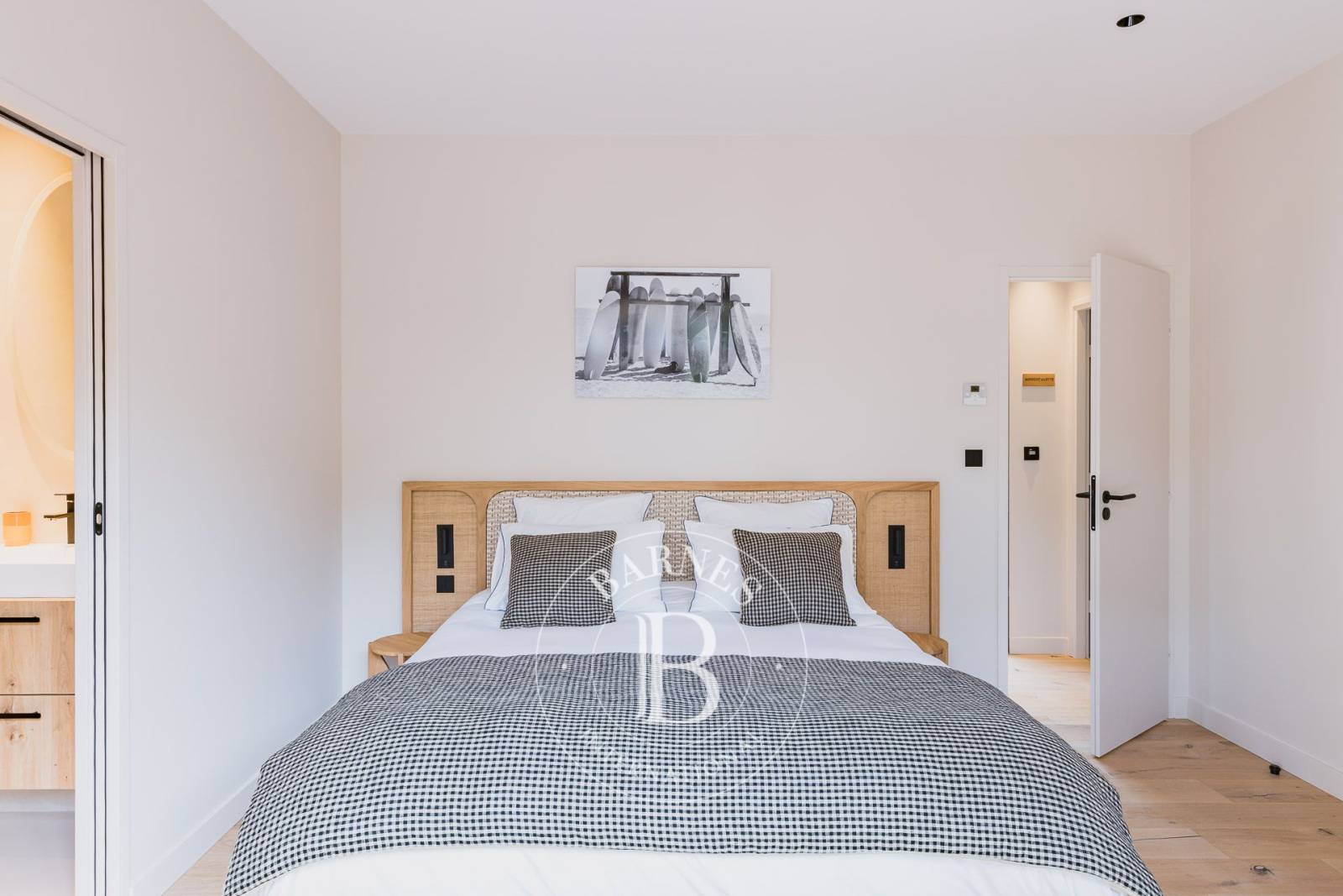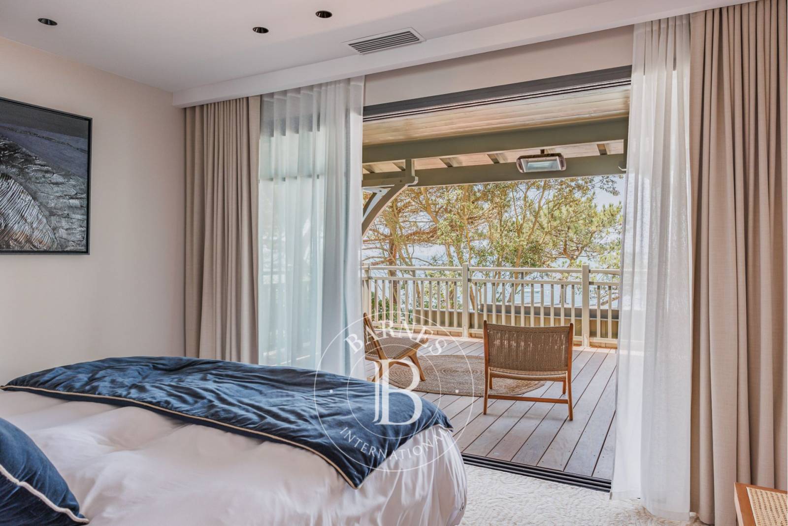 Trois chambres doubles, chacune avec salle d’eau, sont harmonieusement disposées autour de la piscine, offrant un confort optimal et une intimité préservée. À l’étage, quatre chambres supplémentaires, toutes dotées de leur propre salle d’eau, s’ouvrent sur un vaste balcon filant de 72 m². Un spa norvégien complète cet espace, offrant un moment de détente avec une vue panoramique sur Pyla-sur-Mer.