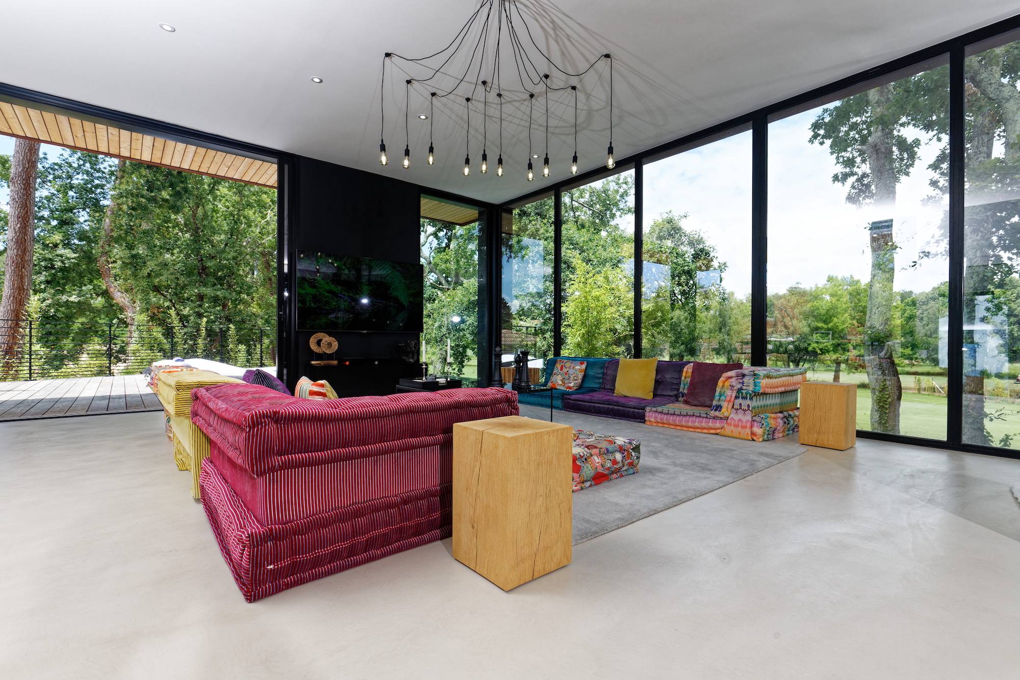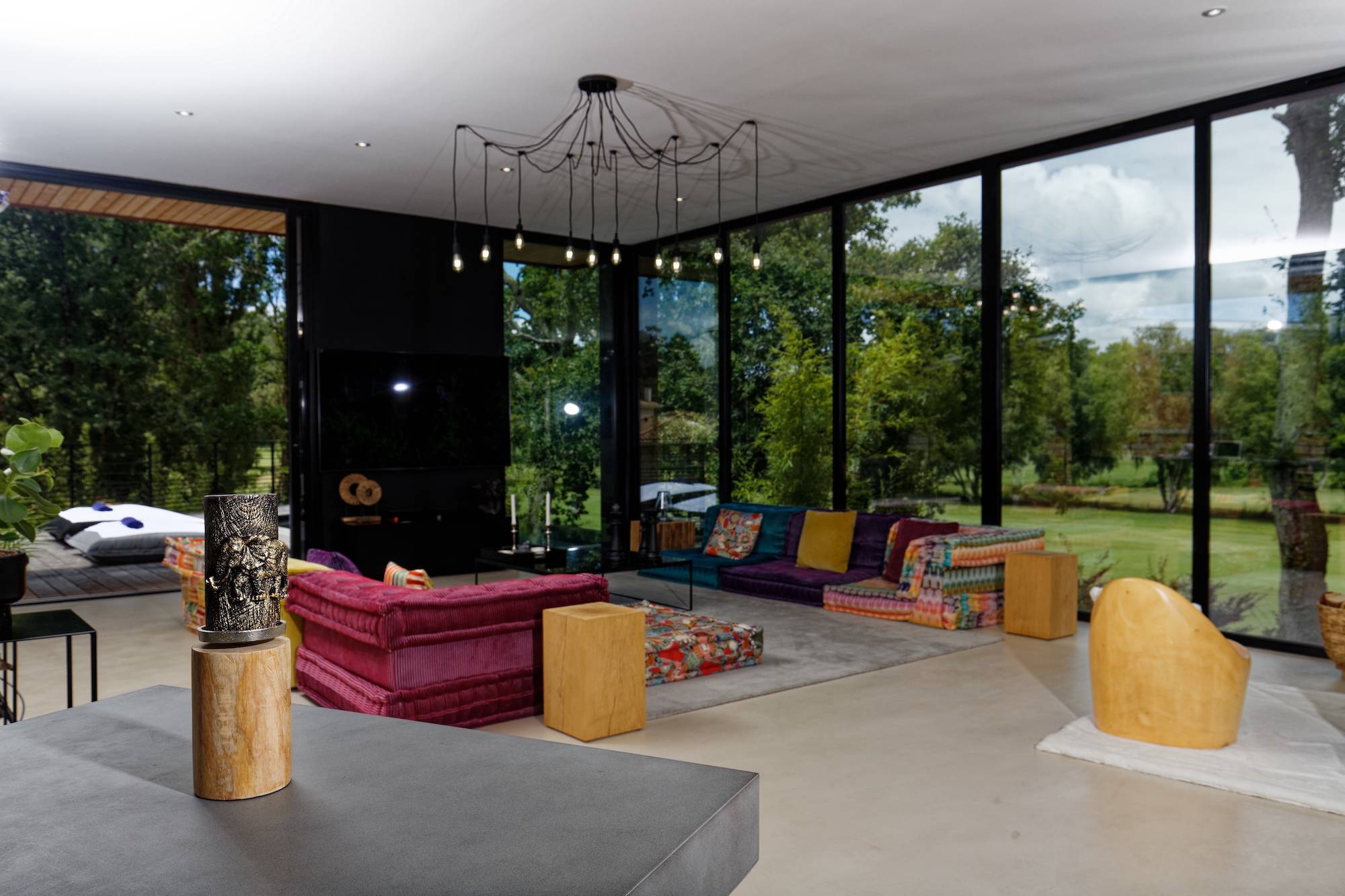 une superbe pièce de vie de 72,52 m2 avec plusieurs expositions vue panoramique sur le Golf d'Arcachon, sol en béton ciré, belle hauteur sous plafond (3 mètres), ouvrant sur la terrasse en IPÉ et la piscine chauffée à débordement, poêle à Gaz. Cuisine avec ilot central, parfaitement aménagée et équipée haut de gamme.