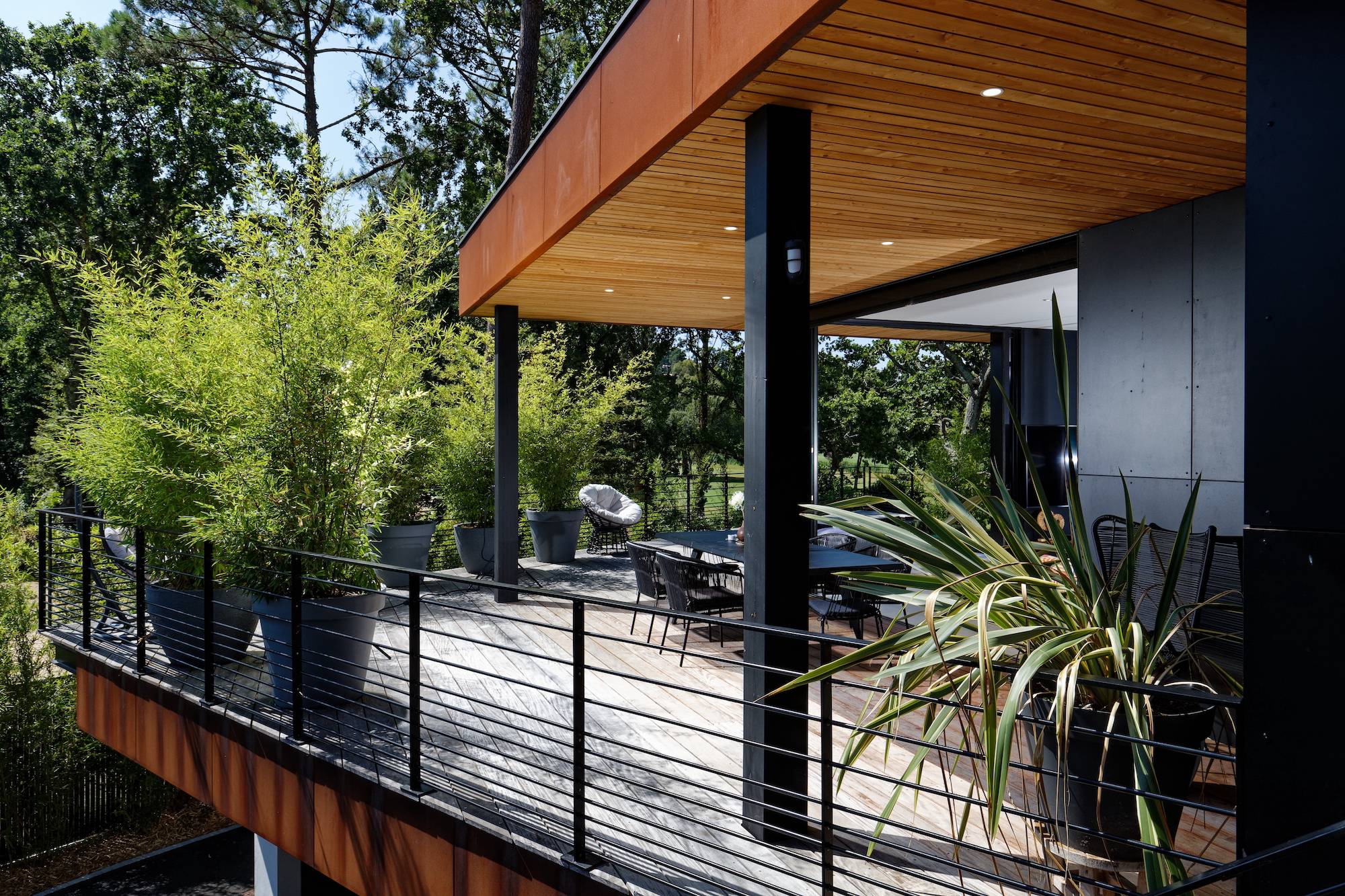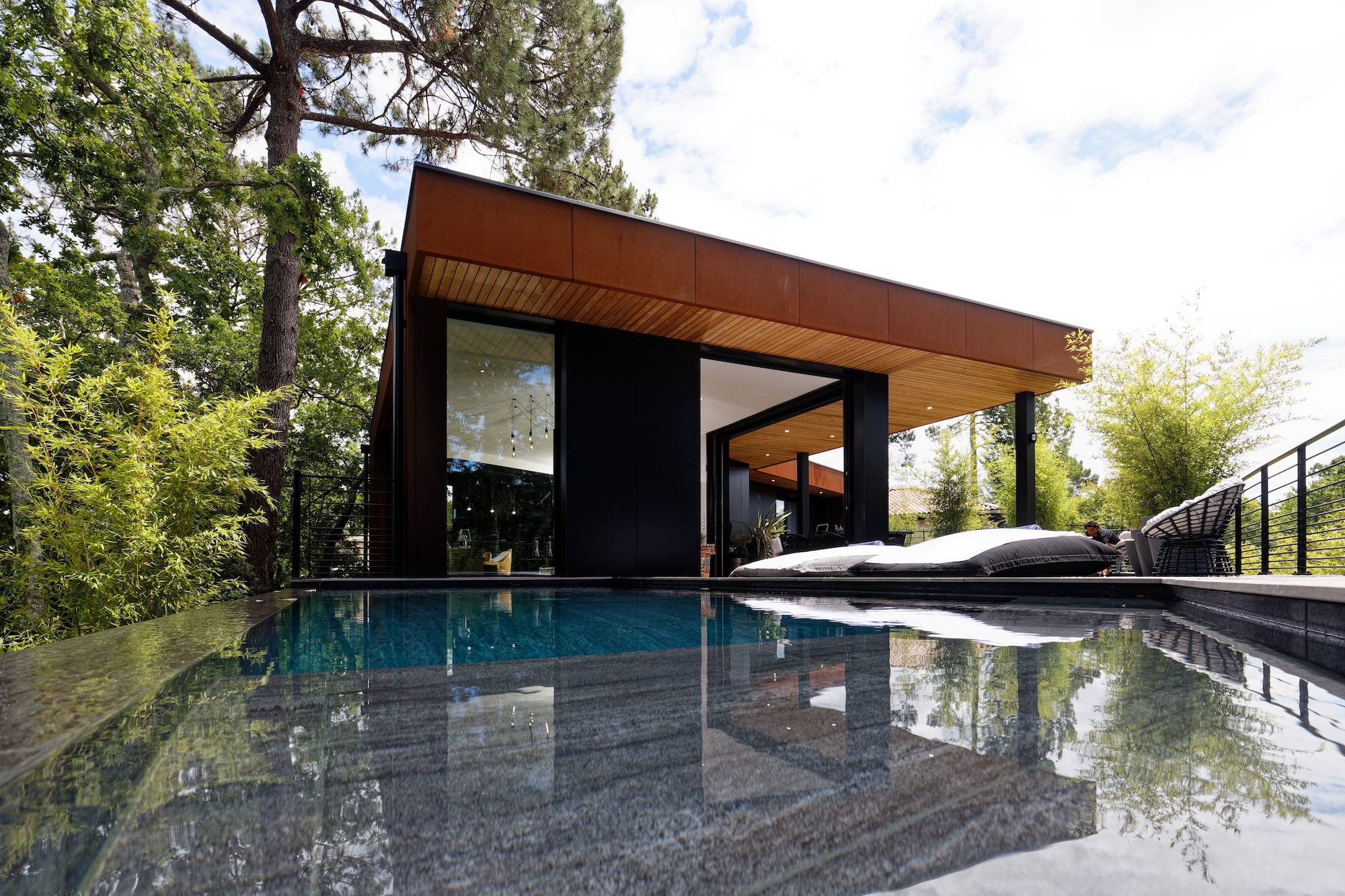 Belle contemporaine toit plat construite en 2019. Matériaux haut de gamme (menuiseries alu noir Technal, acier Corten...)