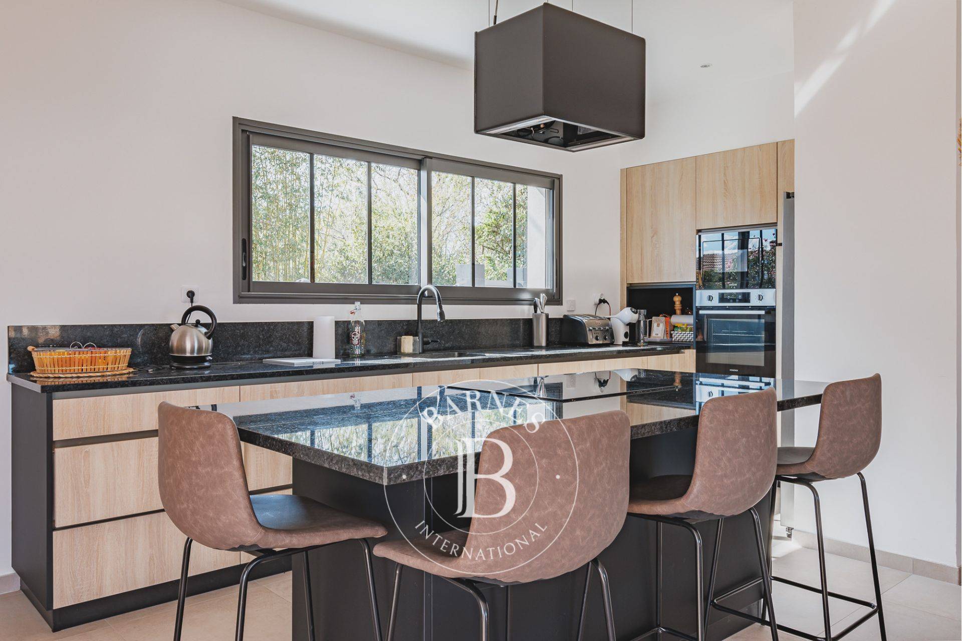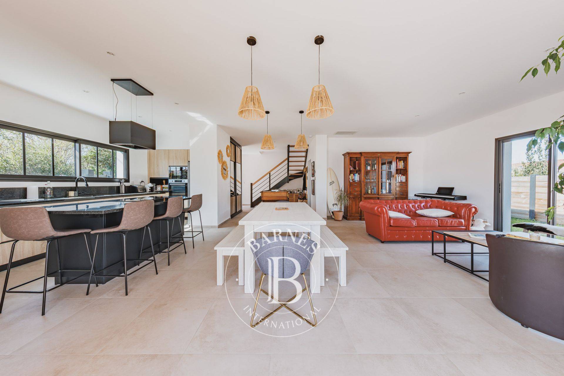 Avec une surface de 145 m², cette maison dispose d’une pièce de vie lumineuse de 68 m², orientée plein ouest pour profiter d’une belle lumière tout au long de la journée. La cuisine aménagée et équipée s’intègre harmonieusement à cet espace. Un cellier attenant ajoute du rangement et de la praticité au quotidien.