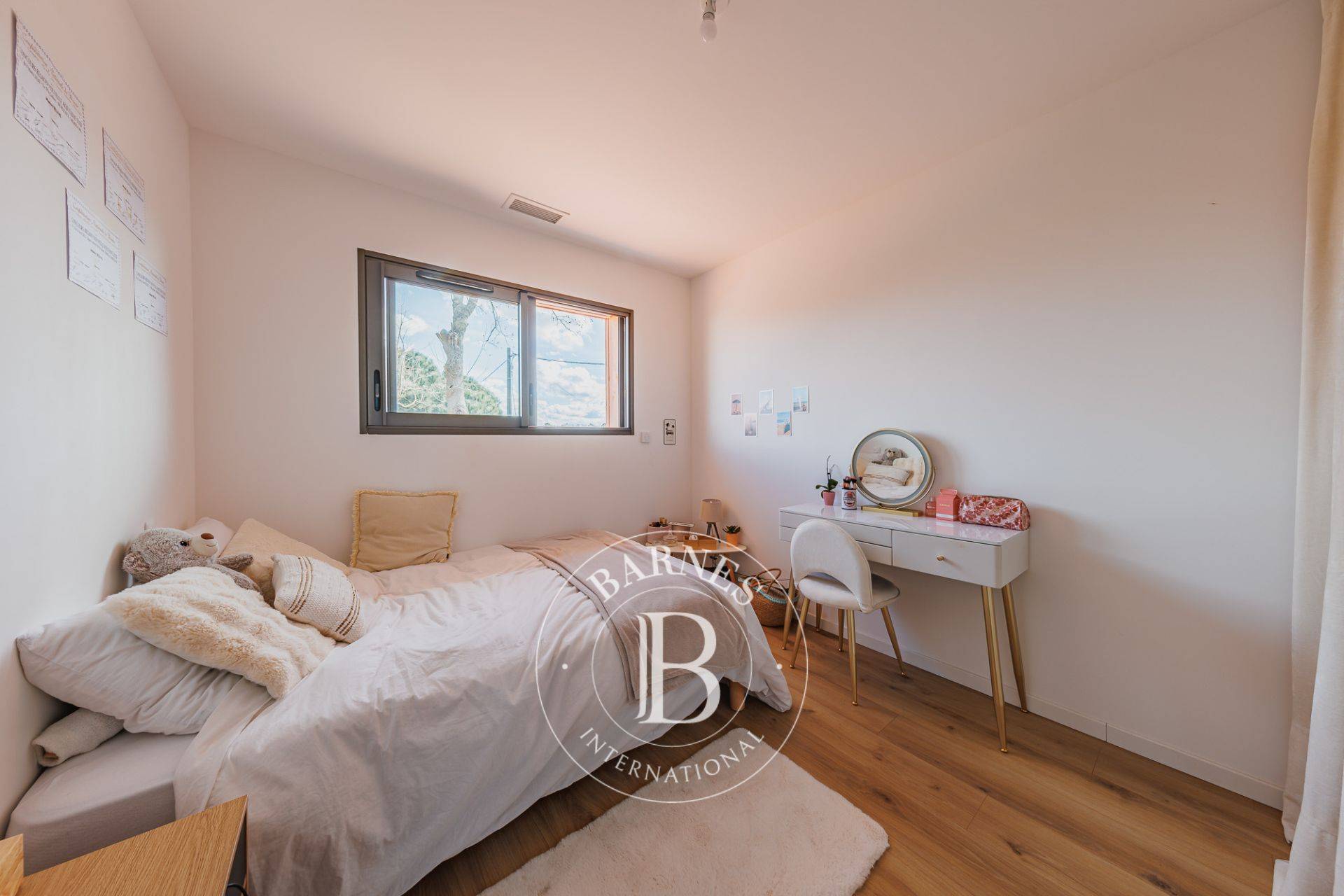 Le rez-de-chaussée comprend une suite parentale avec dressing et salle d’eau. À l’étage, trois chambres avec placards intégrés se partagent une salle d’eau avec toilettes.
