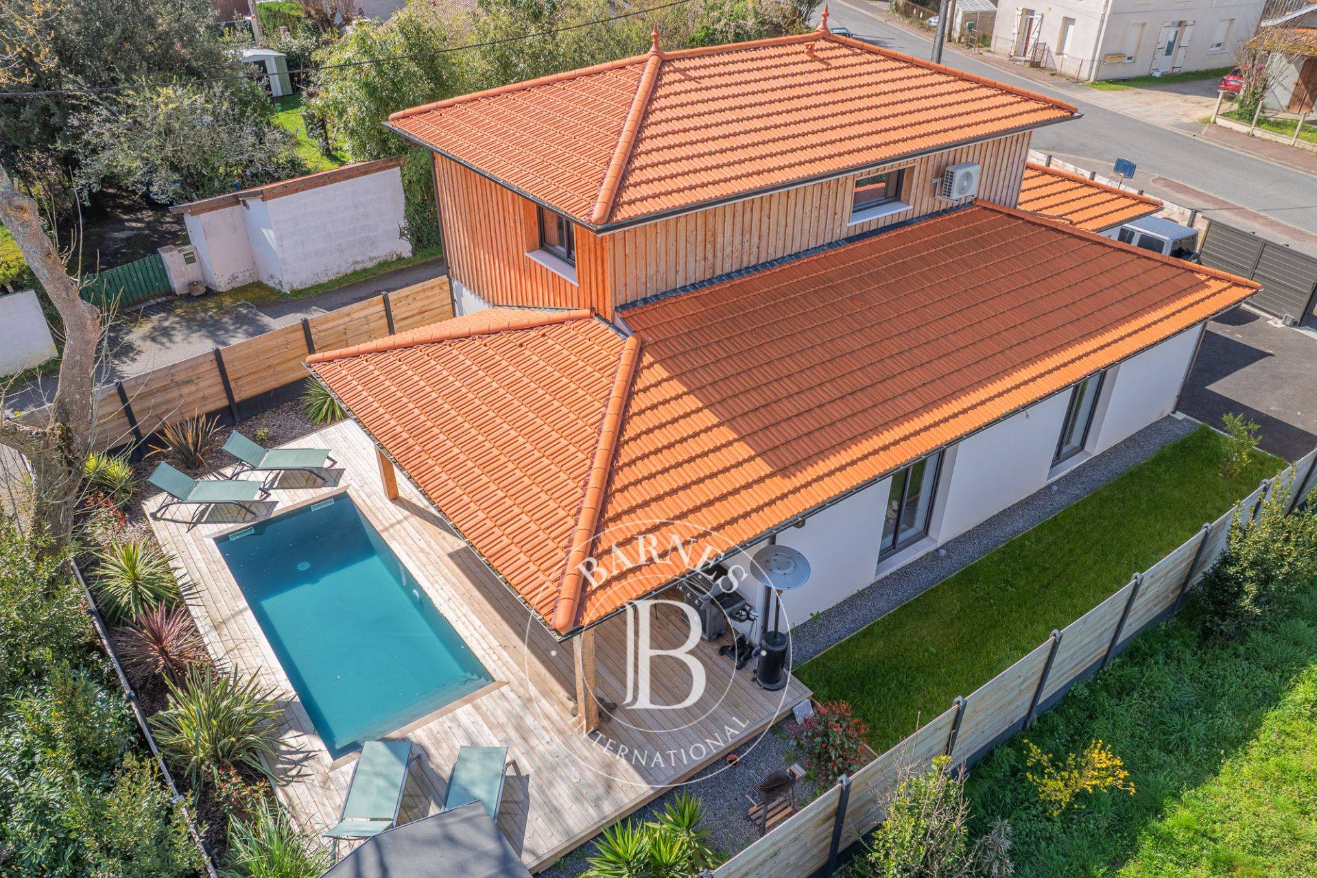 L’extérieur se compose d’une grande terrasse en bois couverte, idéale pour les repas en extérieur, et d’une piscine qui s’intègre parfaitement au jardin. Un garage carrelé et isolé complète ce bien.