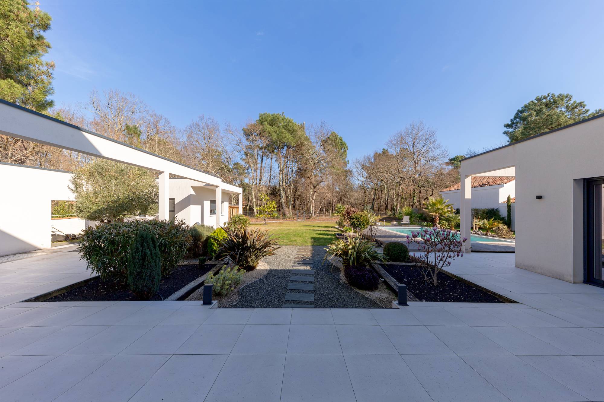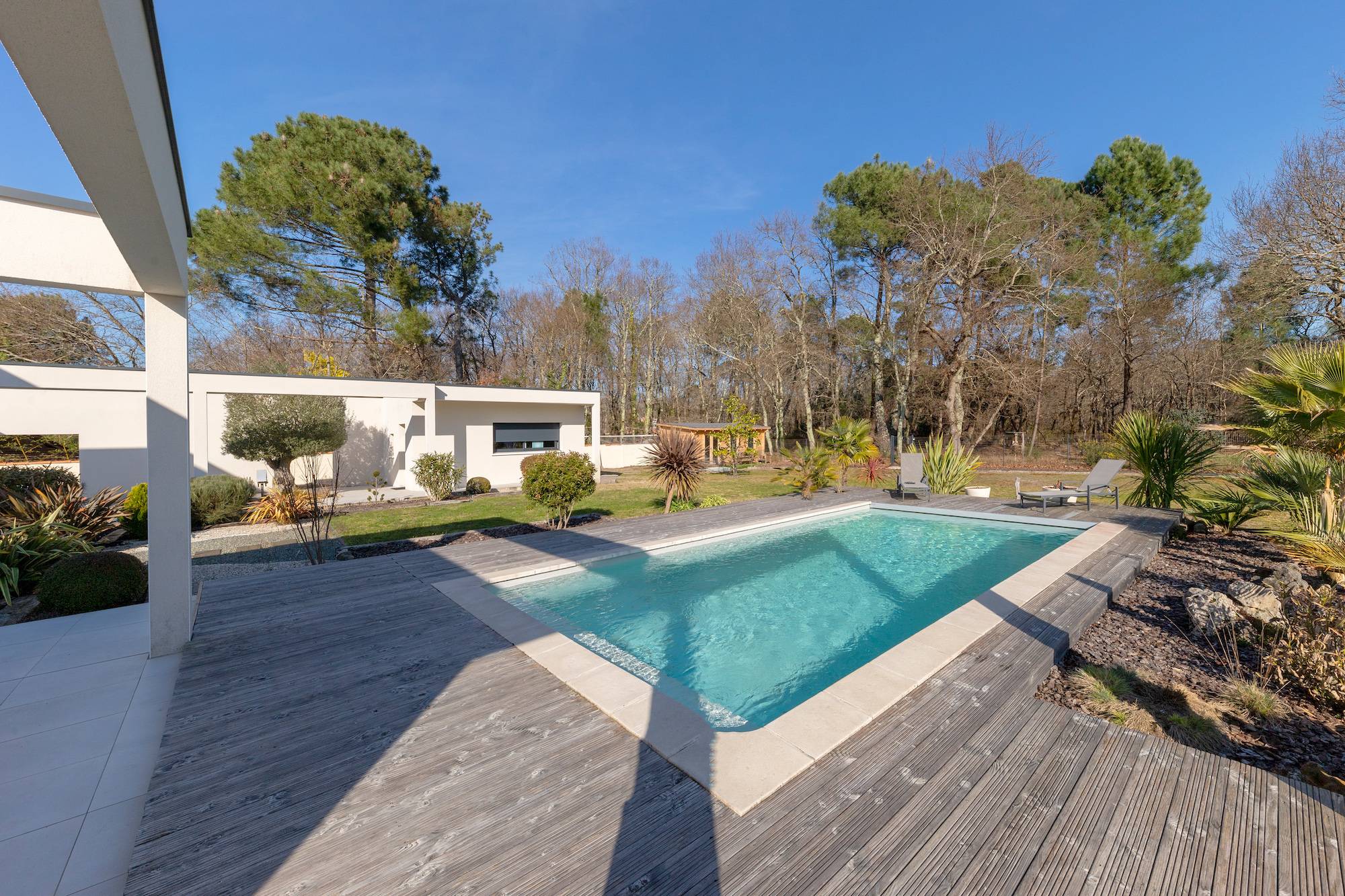Située à Gujan Mestras et nichée au fond d'une impasse, superbe villa d'architecte toit plat, de style californien.