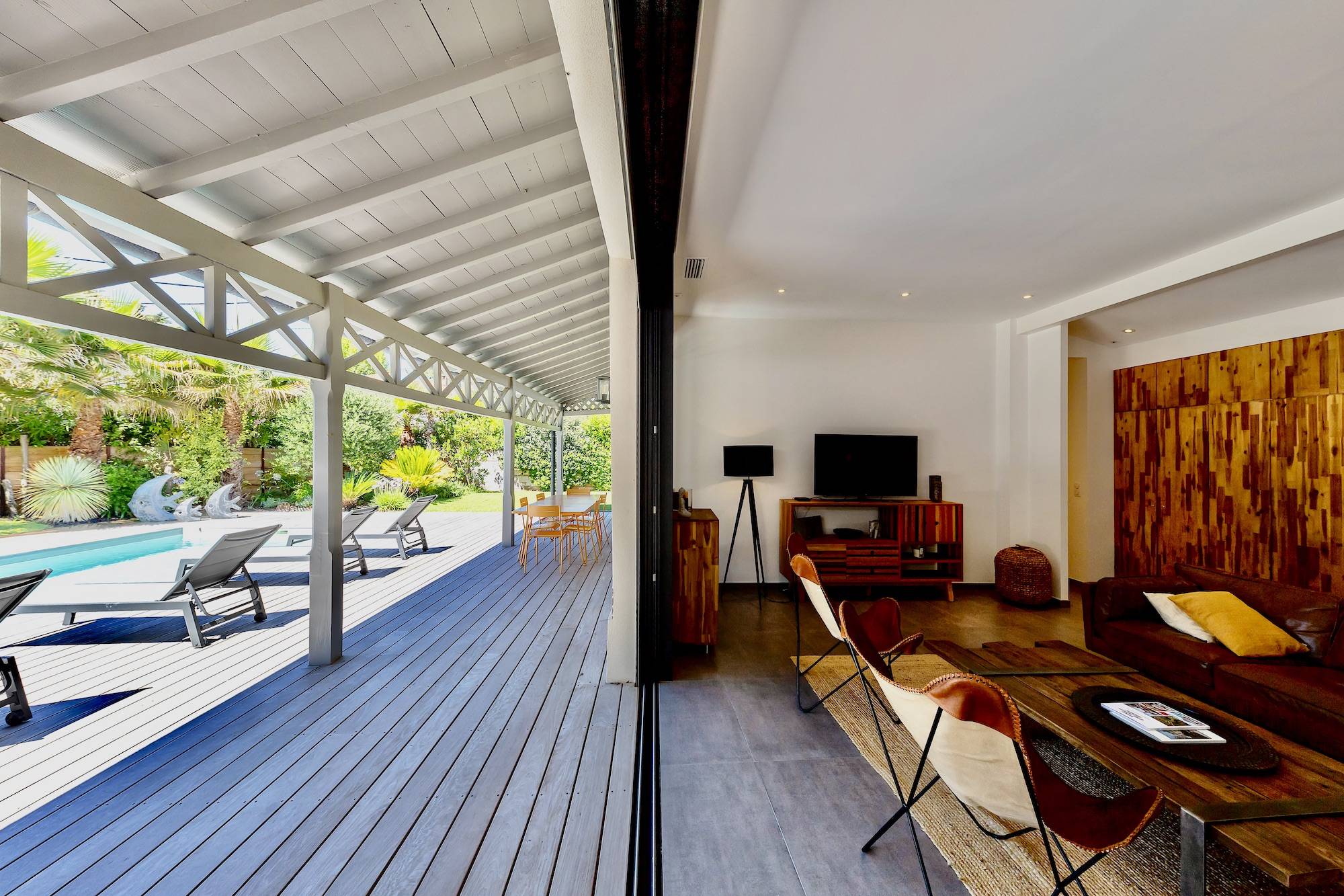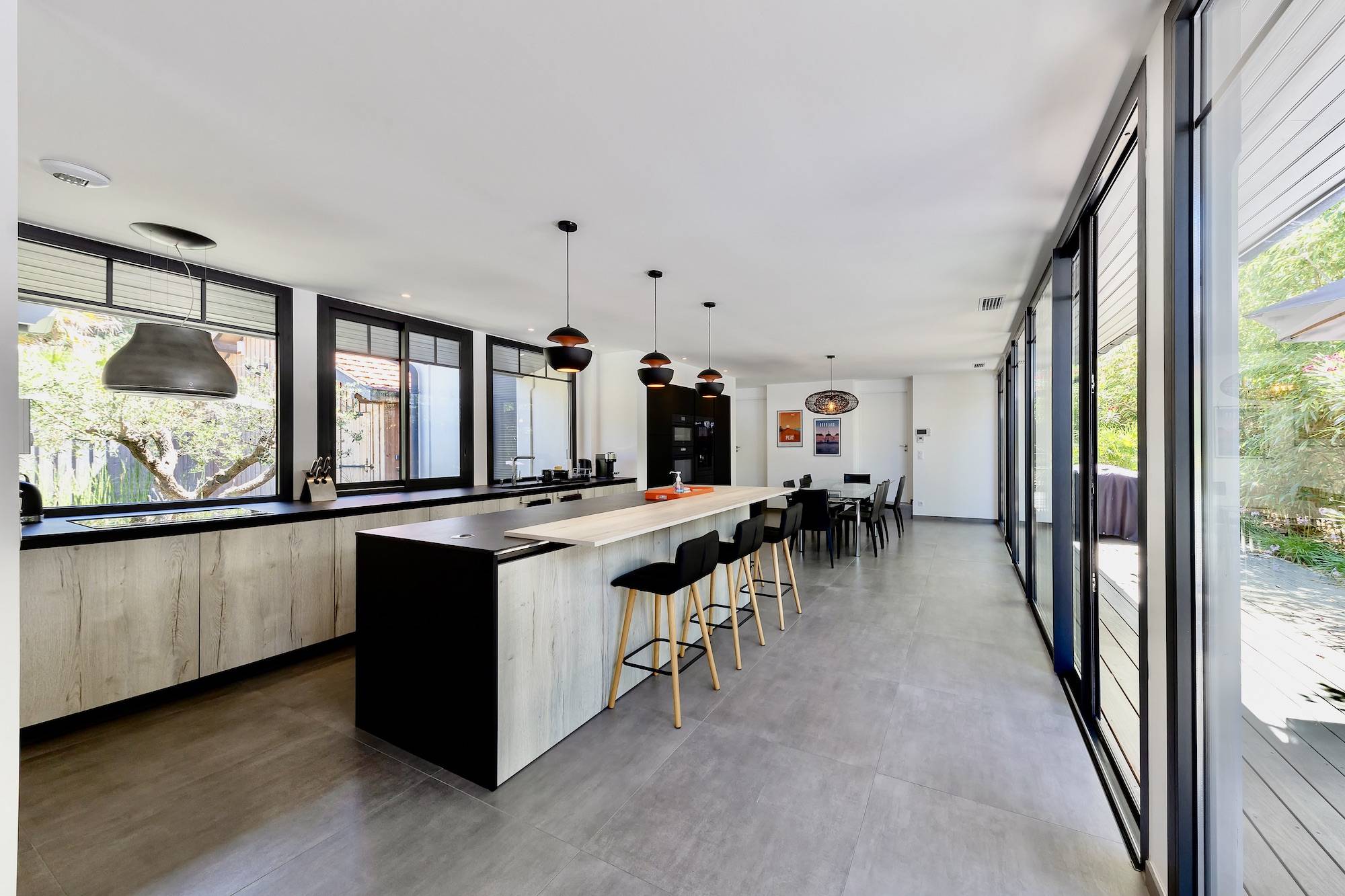 La maison offre une vaste pièce de vie baignée de lumière, ouverte sur une superbe terrasse en bois. La cuisine entièrement équipée, avec son îlot central, est un espace convivial pour les repas.