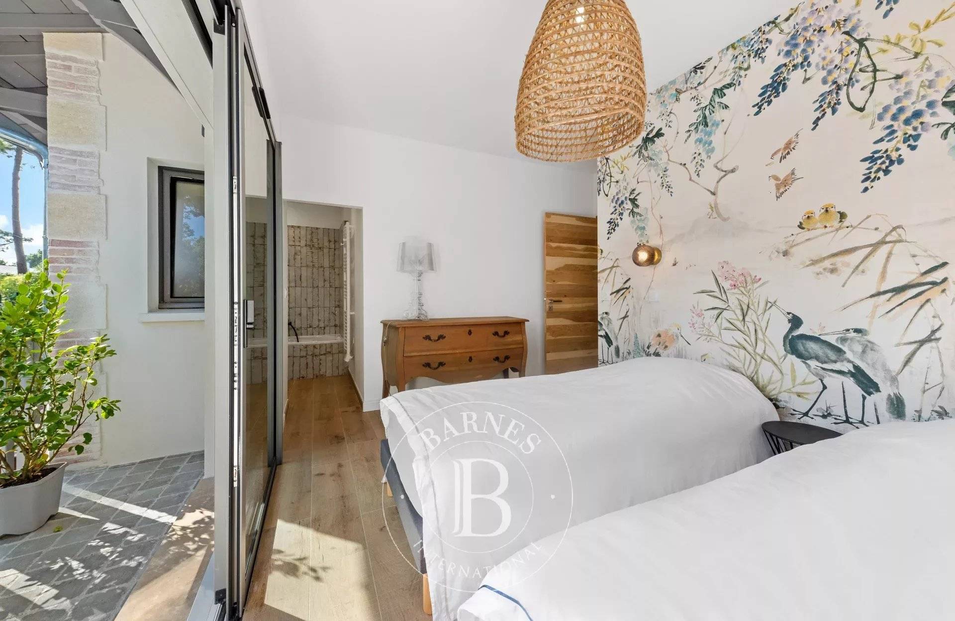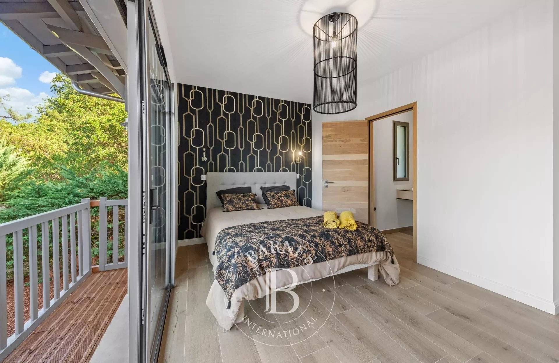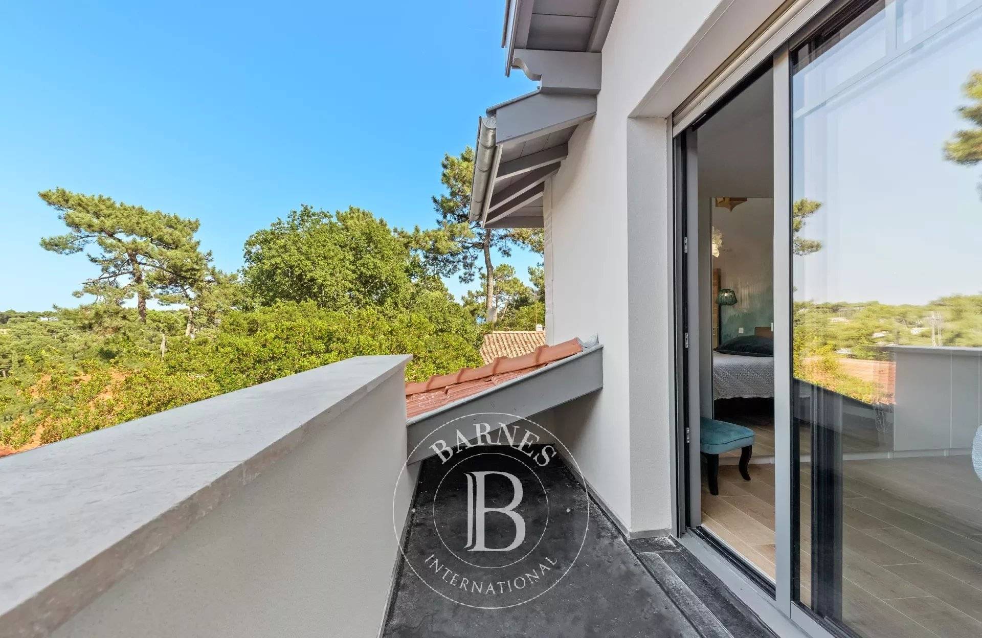 À l'étage, trois vastes chambres dont deux bénéficient d'un balcon offrant une vue imprenable sur la cime des pins. Chacune dispose de sa propre salle d'eau pour plus d'intimité. De plus, une buanderie fonctionnelle complète cet espace.