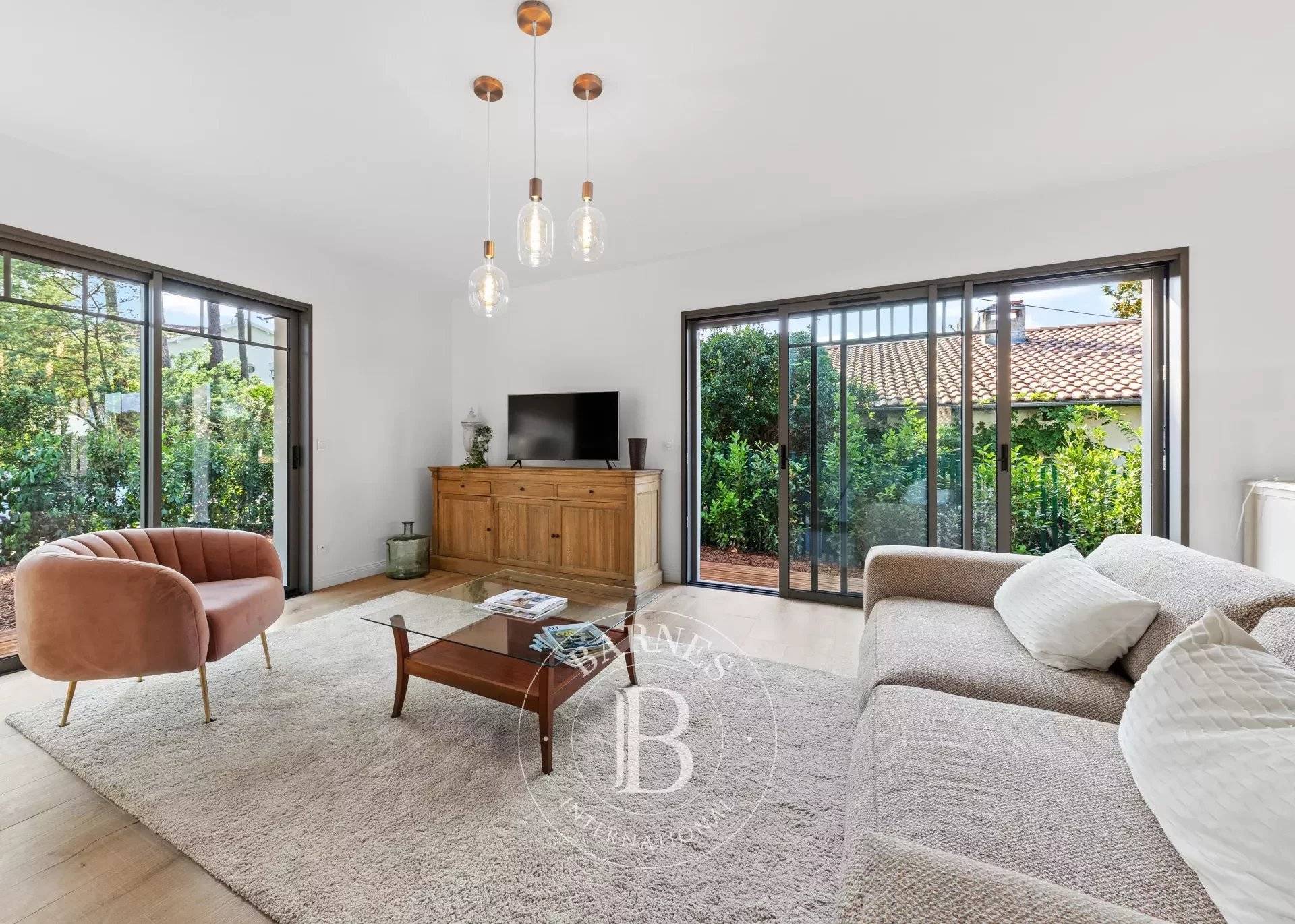 La pièce de vie est traversante et s'ouvre largement sur l'extérieur grâce à de grandes baies vitrées coulissantes. La cuisine américaine est à la fois aménagée et équipée, agrémentée d'un îlot central. Quelques marches mènent à la terrasse et à la piscine.
