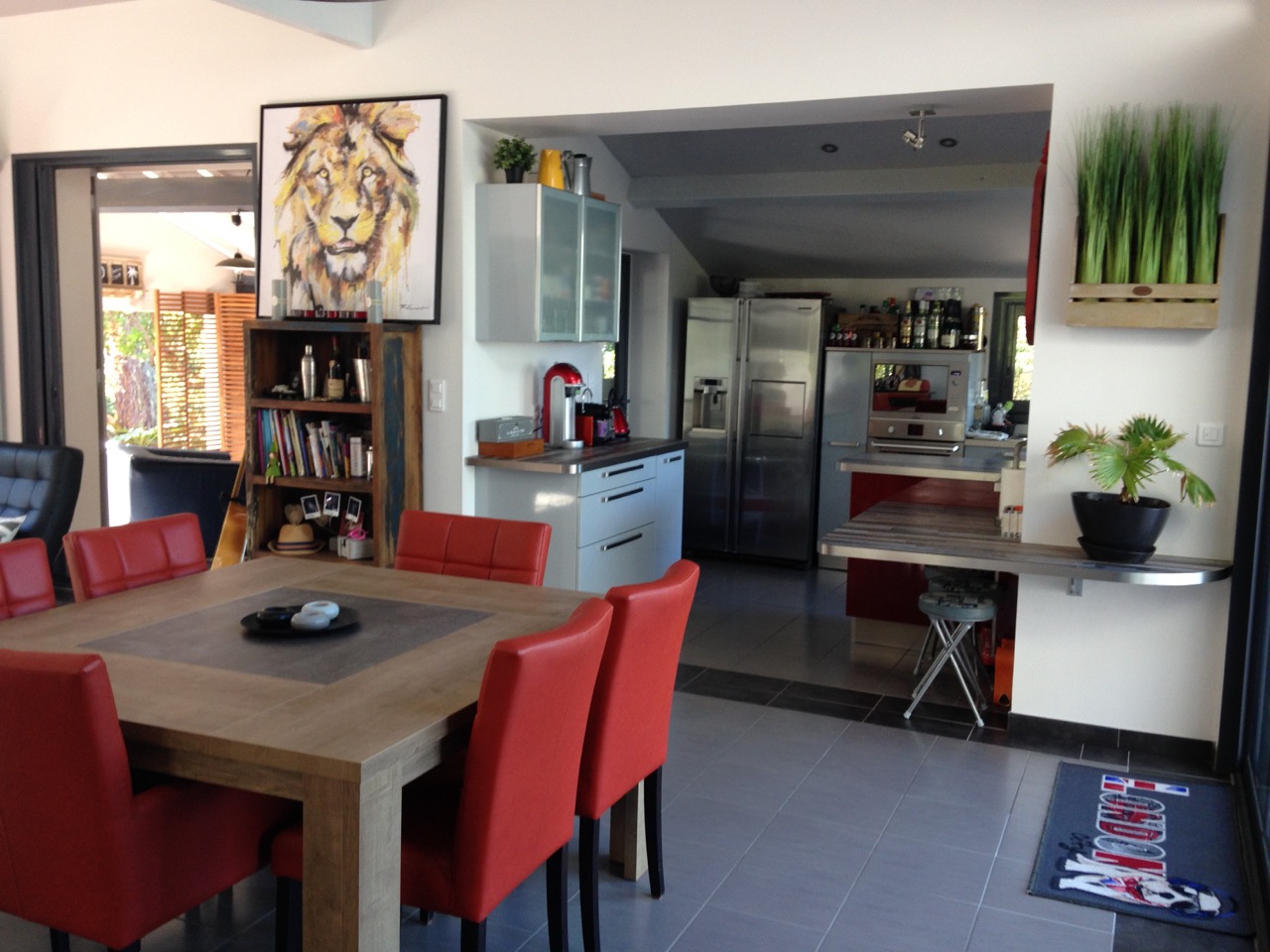 Entrée avec bureau, belle cuisine équipée ouverte sur séjour, 3 chambres en rez de jardin, 2 chambres à l'étage (une avec balcon).