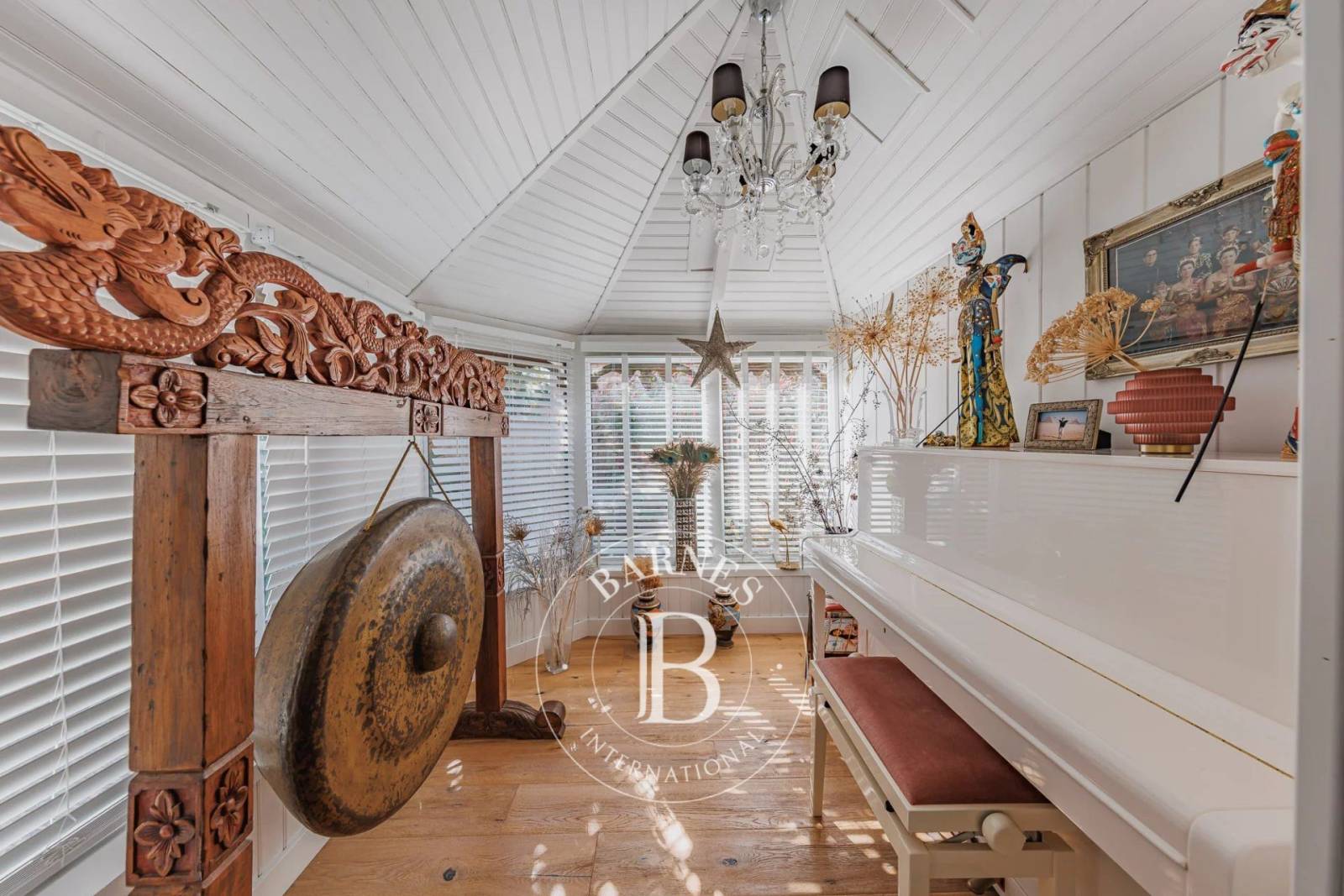 L’entrée mène à un séjour lumineux, ainsi qu'à un salon de musique.