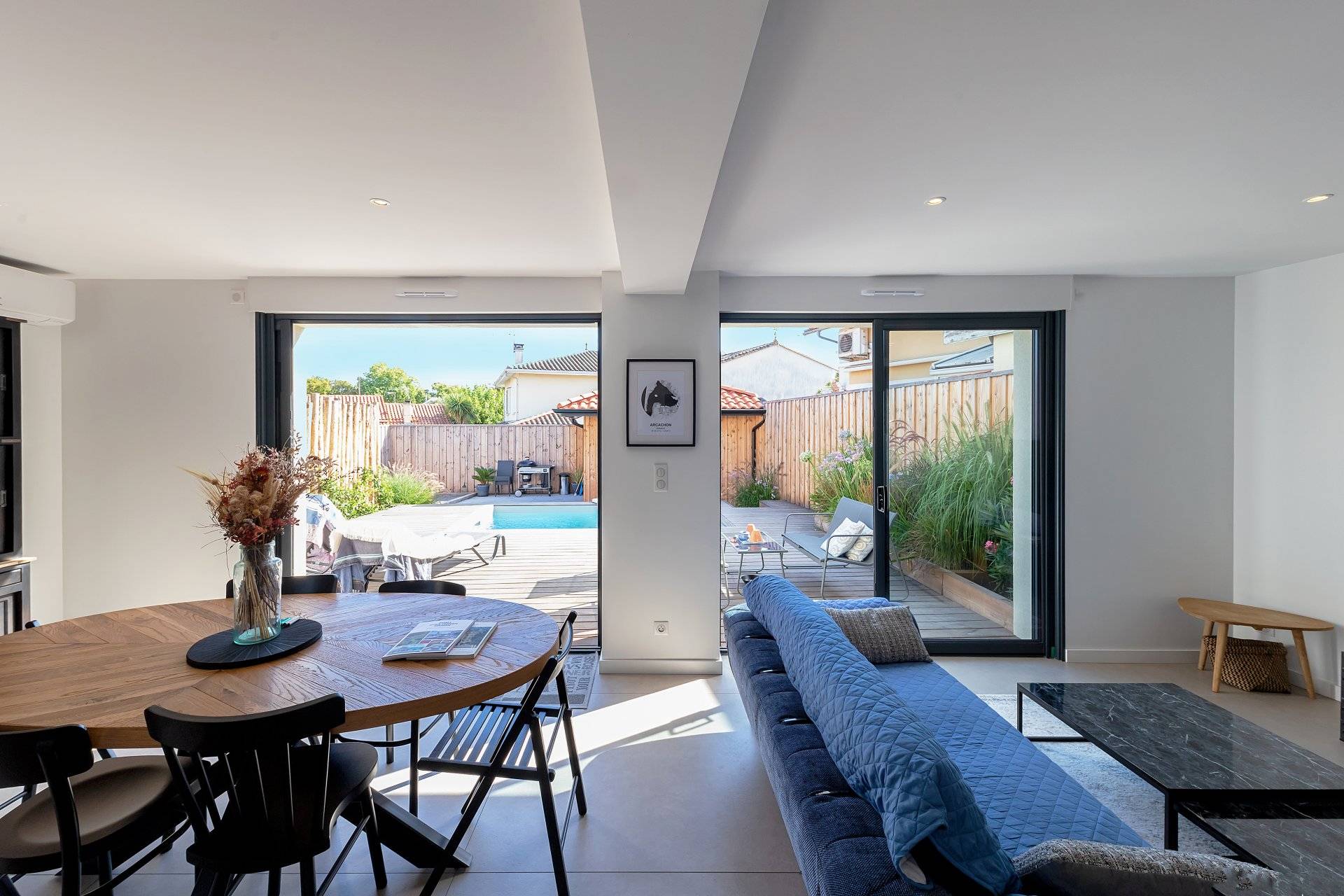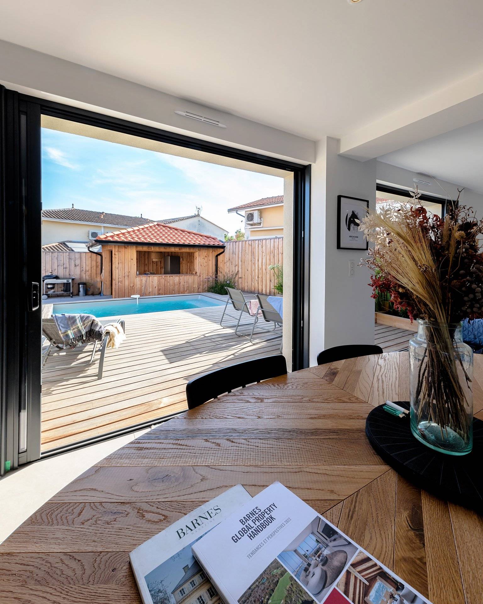 Une belle pièce de vie avec une cuisine ouverte, donnant sur la jolie terrasse et la piscine,