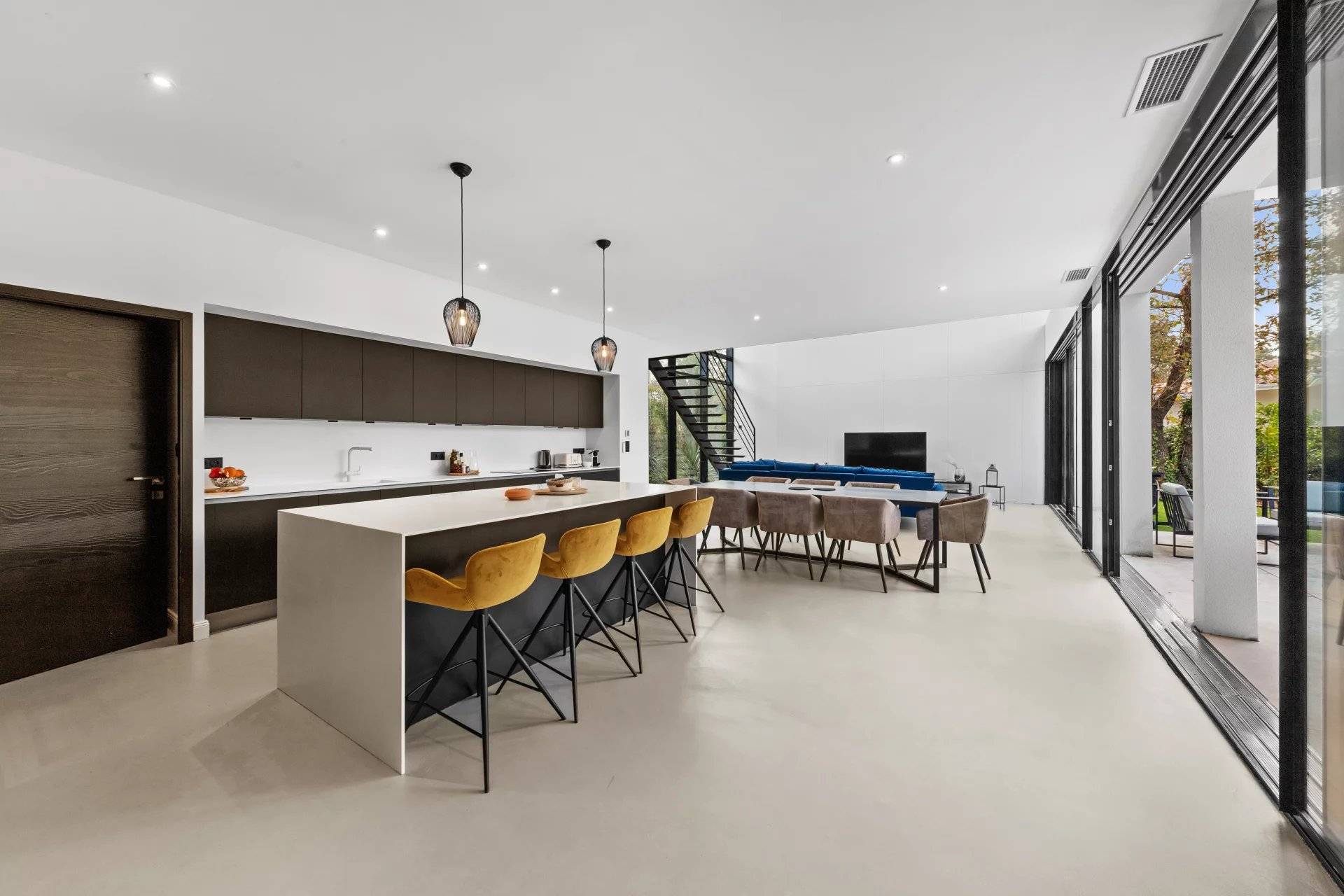 La villa, d’environ 240 m² habitables, s’organise autour d’une pièce de vie spacieuse et lumineuse, mise en valeur par une belle hauteur sous plafond. La cuisine, entièrement aménagée et équipée, s’articule autour d’un îlot central. Un cellier/buanderie complète cet espace.