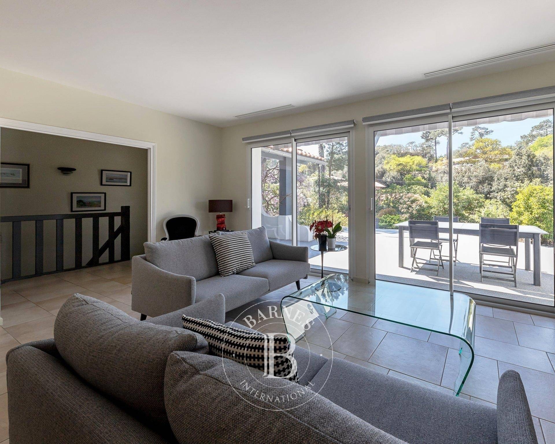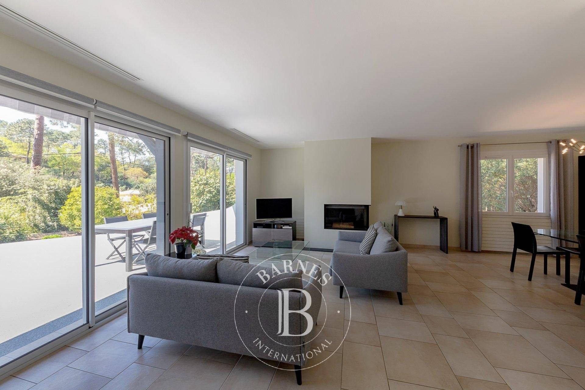 Située au calme, dans un environnement très verdoyant, les pins pour voisinage, belle villa traditionnelle entièrement rénovée en 2021. Villa de 7 pièces d'une surface d'environ 160 m2 : entrée, pièce de vie avec insert, cuisine indépendante aménagée et équipée, buanderie. Pour la partie nuit, la villa dispose de 6 chambres, salle d'eau et salle de bains. Garage double, cellier, espaces de stationnement pour les véhicules. Joli jardin fleuri, arboré et paysagé avec beaucoup de soin, belle terrasse avec piscine à l'abri des regards. A quelques minutes du Golf d'Arcachon et des plages du Pyla sur mer.