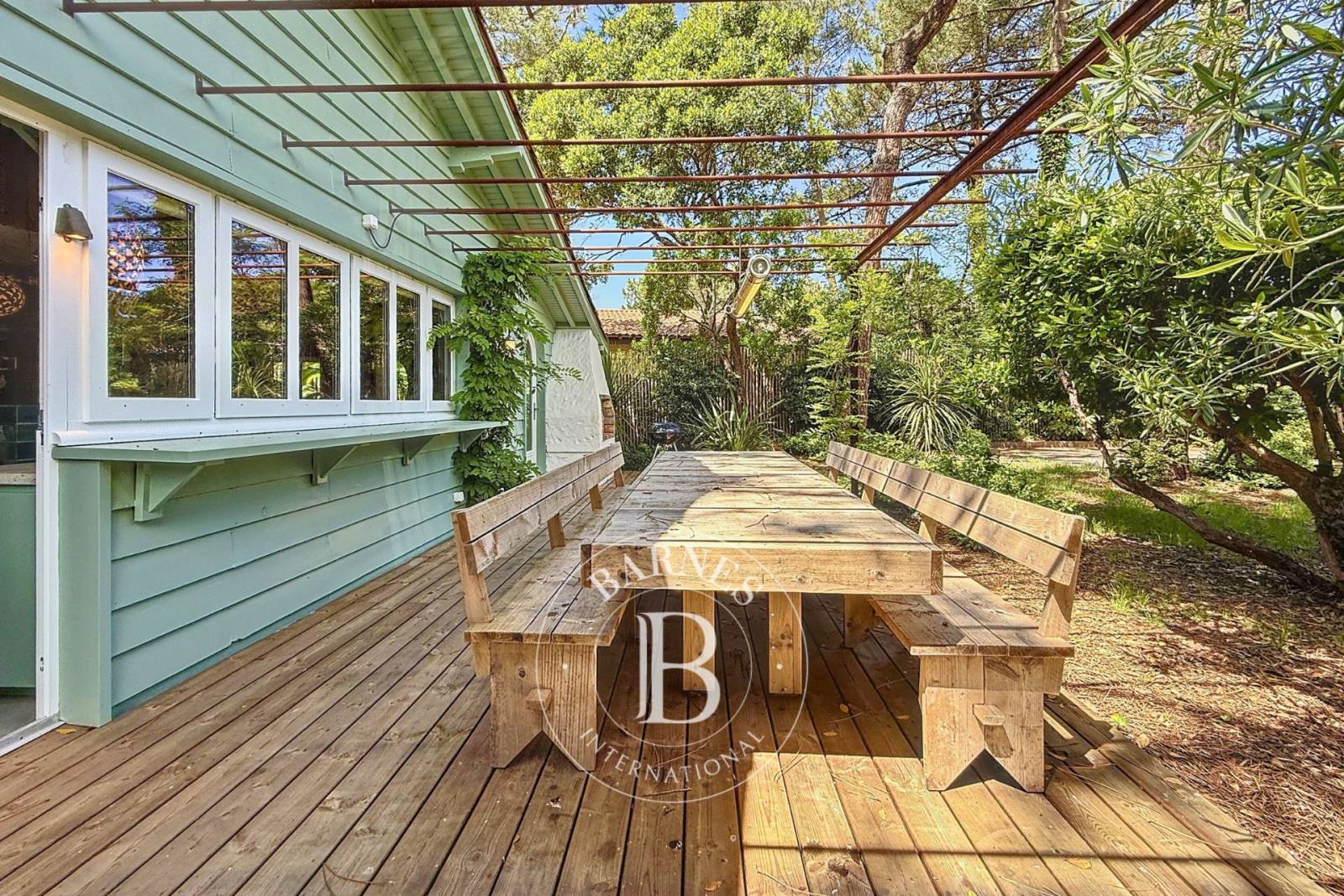 Cette villa traversante bénéficie d’une belle luminosité. Le salon s’ouvre sur une large terrasse en bois, baignée de soleil. Côté cuisine-salle à manger, une seconde terrasse à l’ombre naturelle de la végétation accueille un coin repas avec barbecue intégré.