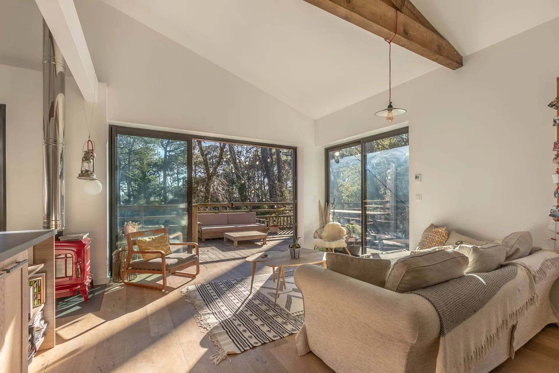 Le salon-séjour lumineux, cœur de cette villa, offre une atmosphère chaleureuse et accueillante. Il s'ouvre sur une terrasse couverte qui propose un bel aperçu sur le bassin, invitant à la détente et à la contemplation.