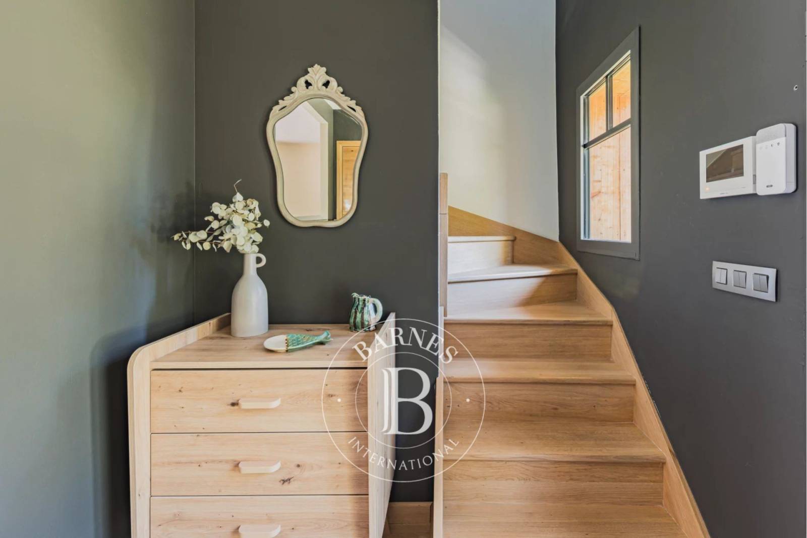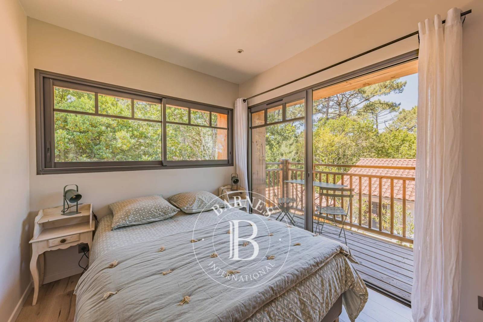 L’étage dessert quatre chambres lumineuses, chacune bénéficiant de sa propre salle d’eau. Chacune s’ouvre sur un balcon filant qui surplombe le jardin.