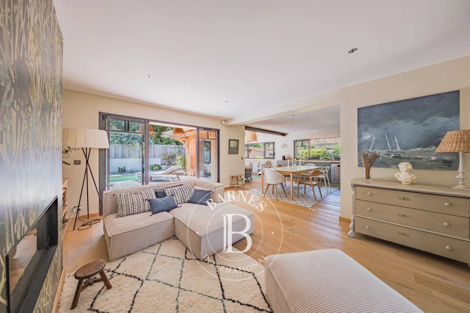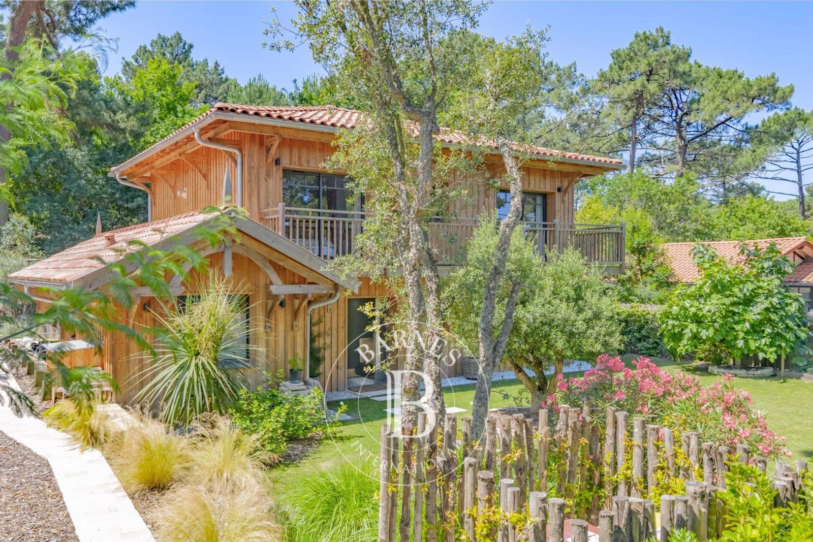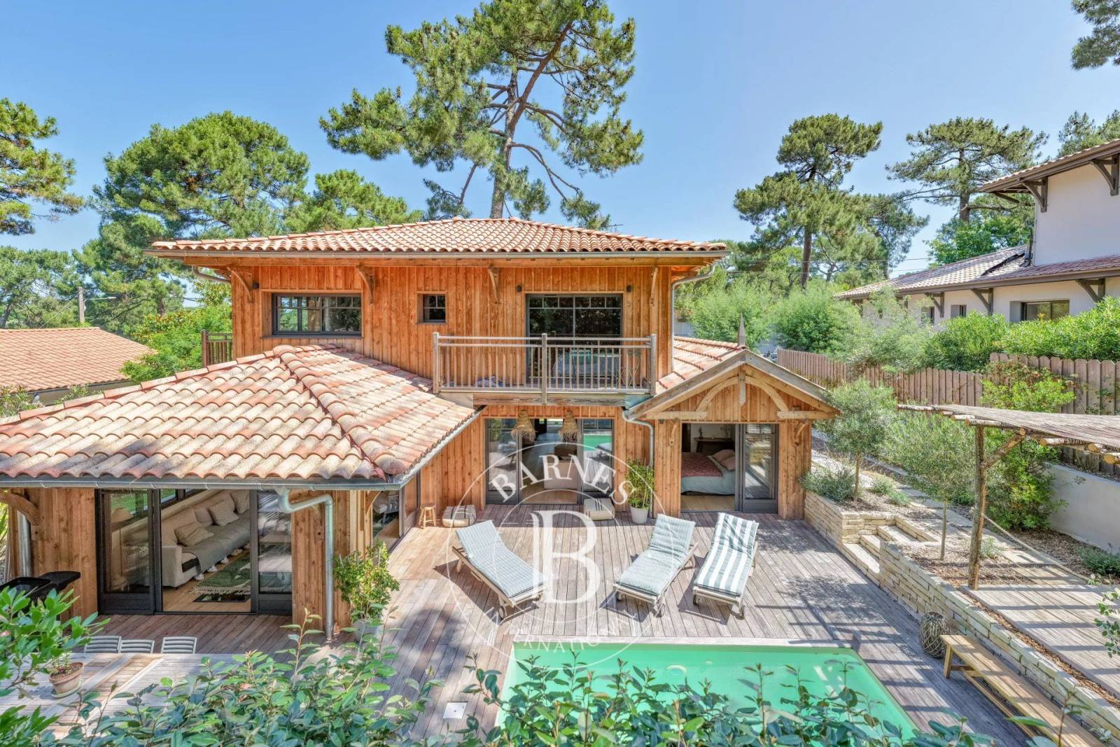 À l’extérieur, la vie s’organise autour d’une vaste terrasse en bois exotique de 160 m² et d’une piscine orientée sud, parfaitement intégrée au jardin paysager et clos. Une pergola en pignots et canisses compose un espace ombragé, idéal pour les repas d’été. Un cabanon vient compléter l’ensemble.