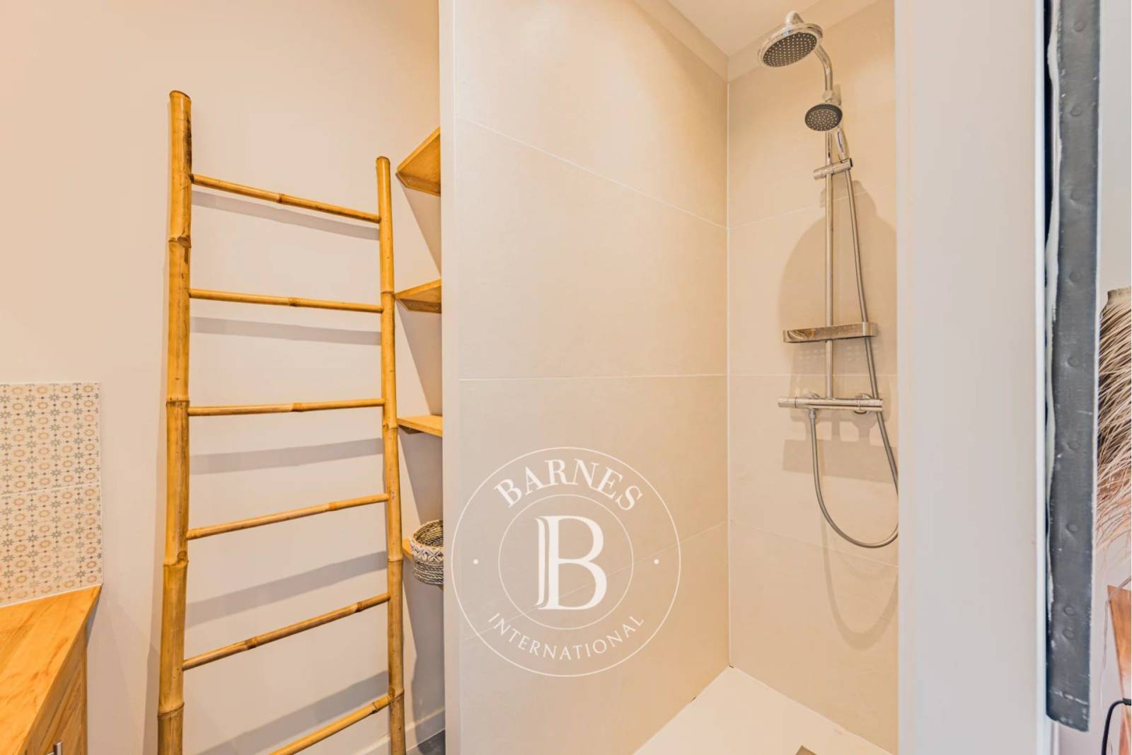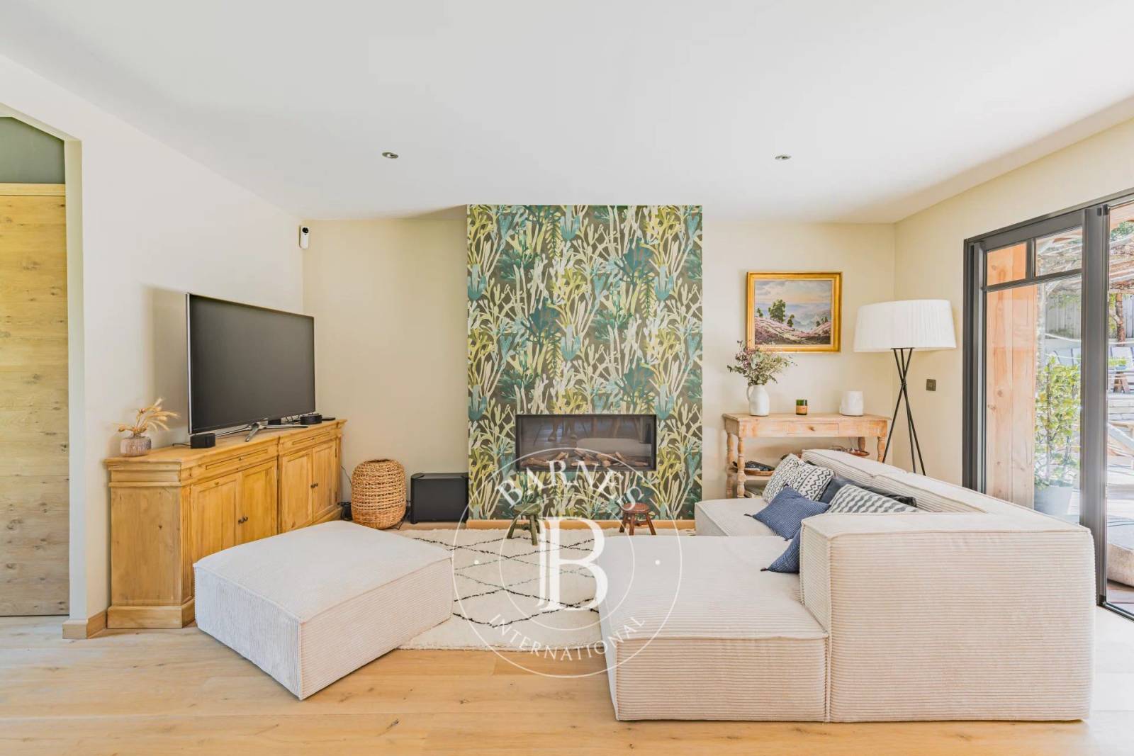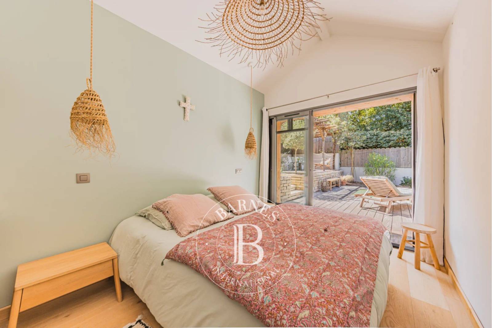À l’extérieur, la vie s’organise autour d’une vaste terrasse en bois exotique de 160 m² et d’une piscine orientée sud, parfaitement intégrée au jardin paysager et clos. Une pergola en pignots et canisses compose un espace ombragé, idéal pour les repas d’été. Un cabanon vient compléter l’ensemble.
