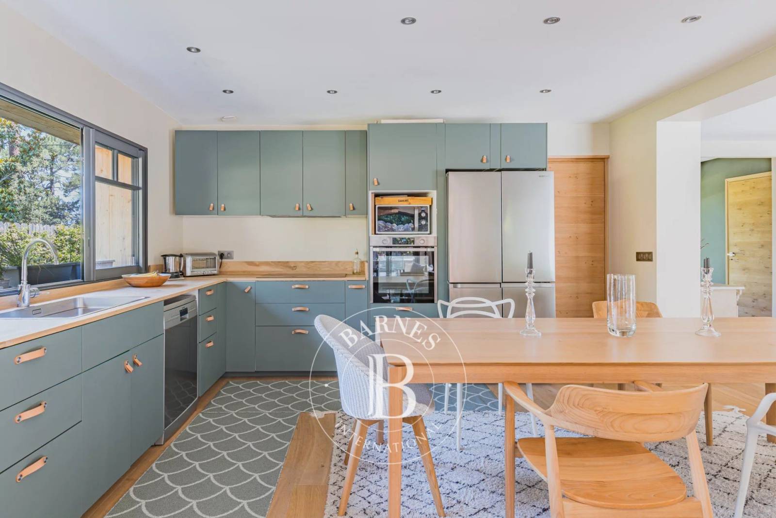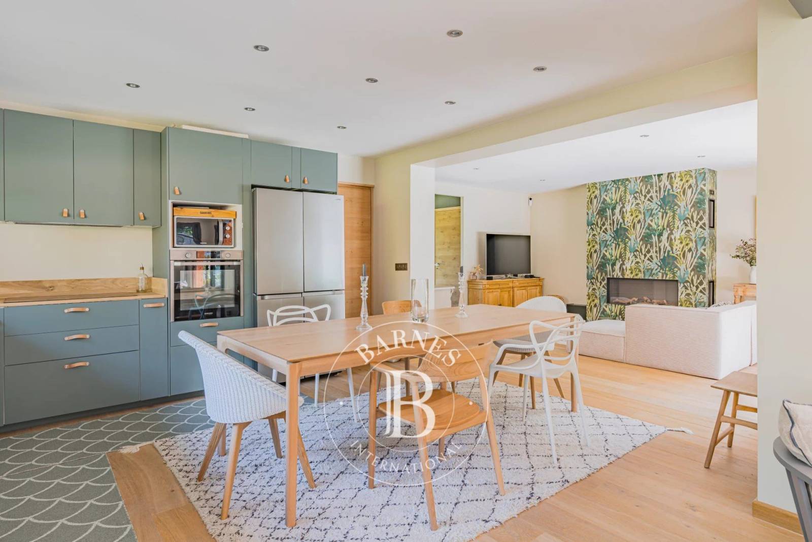 La villa propose une surface habitable de 160 m², organisée autour de plusieurs espaces de vie baignés de lumière. Dès l’entrée, un salon avec cheminée accueille chaleureusement les invités. Un second salon, orienté plein sud, s’ouvre largement sur la piscine et le jardin, prolongeant l’intérieur vers la grande terrasse. La cuisine ouverte s’impose comme le cœur de la maison. Elle bénéficie d’un accès direct à une arrière-cuisine fonctionnelle comprenant cellier et buanderie, pensée pour un usage quotidien pratique.