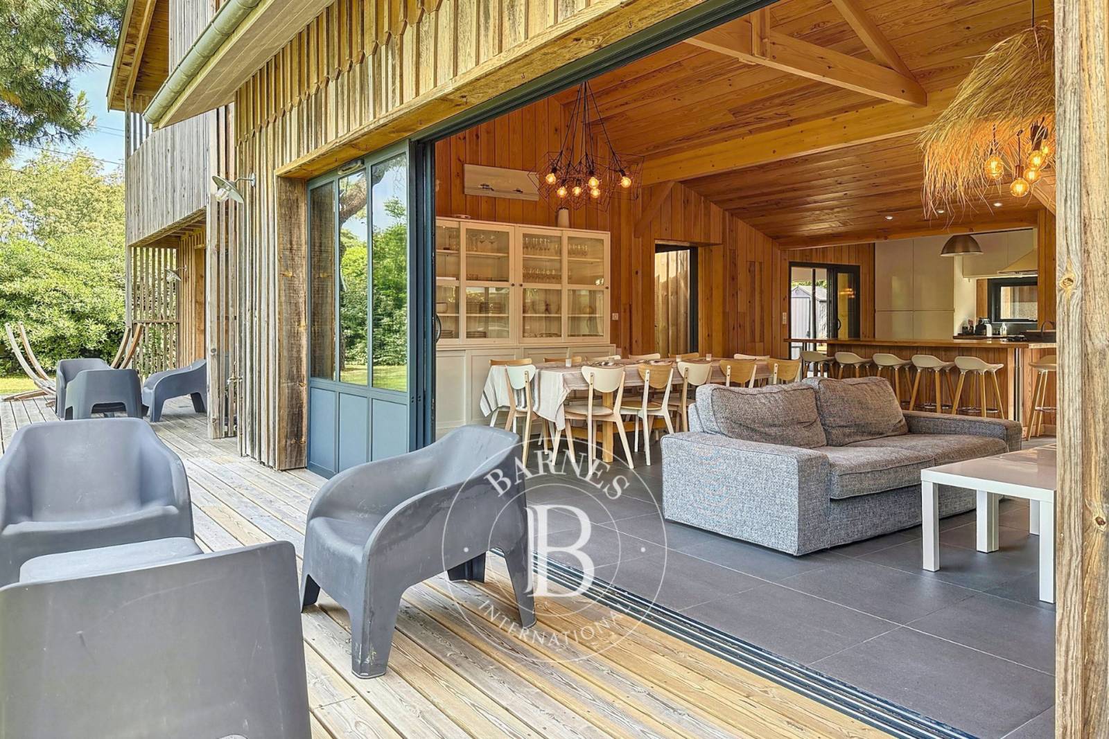 Organisée autour d’une pièce de vie traversante d’environ 60 m², la maison offre des volumes généreux avec une belle hauteur sous plafond et un poêle à bois, pour profiter du lieu toute l’année. La cuisine s’intègre naturellement à cet espace de vie chaleureux, avec accès direct à la terrasse.