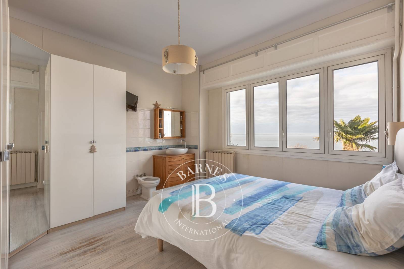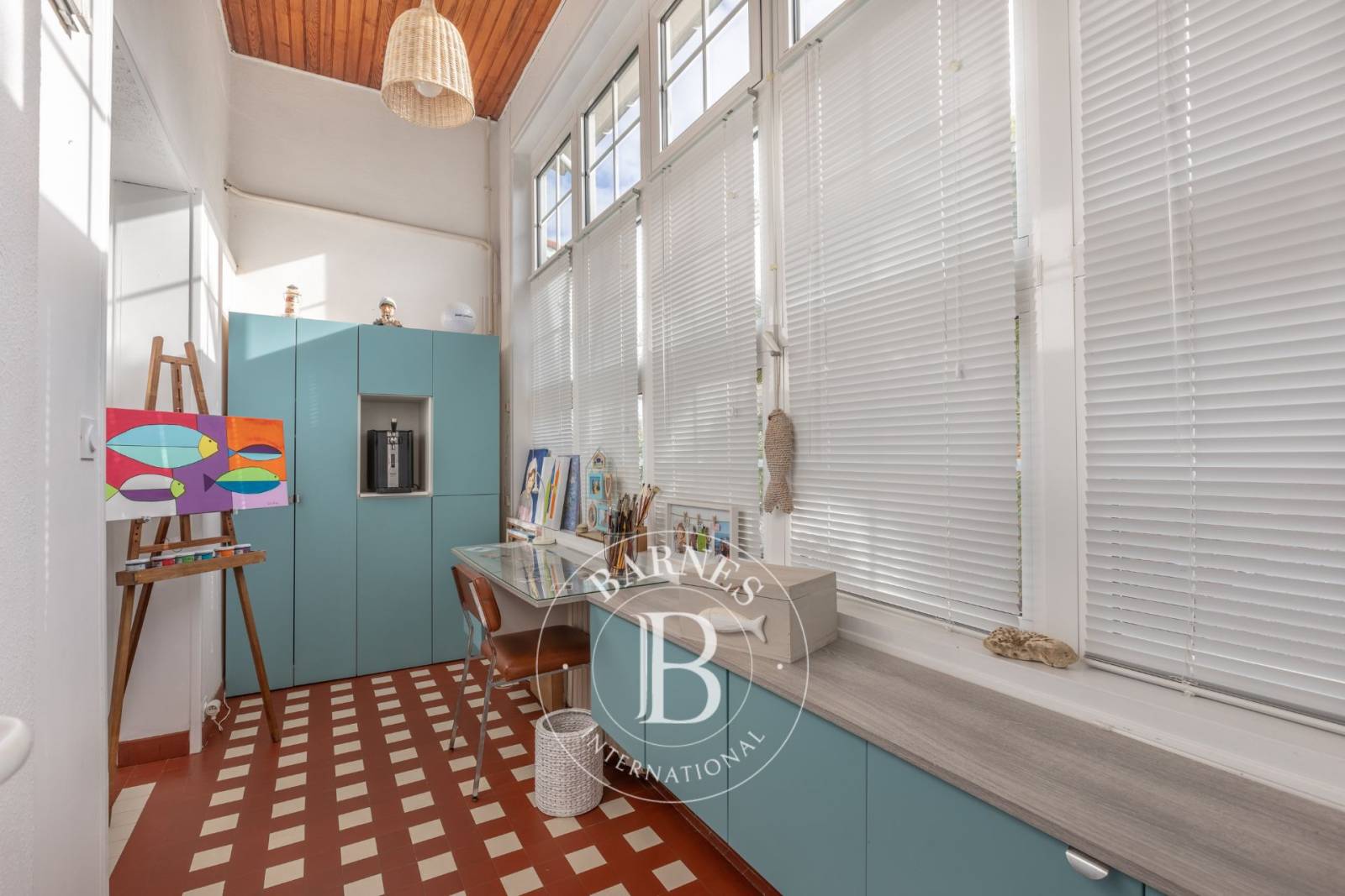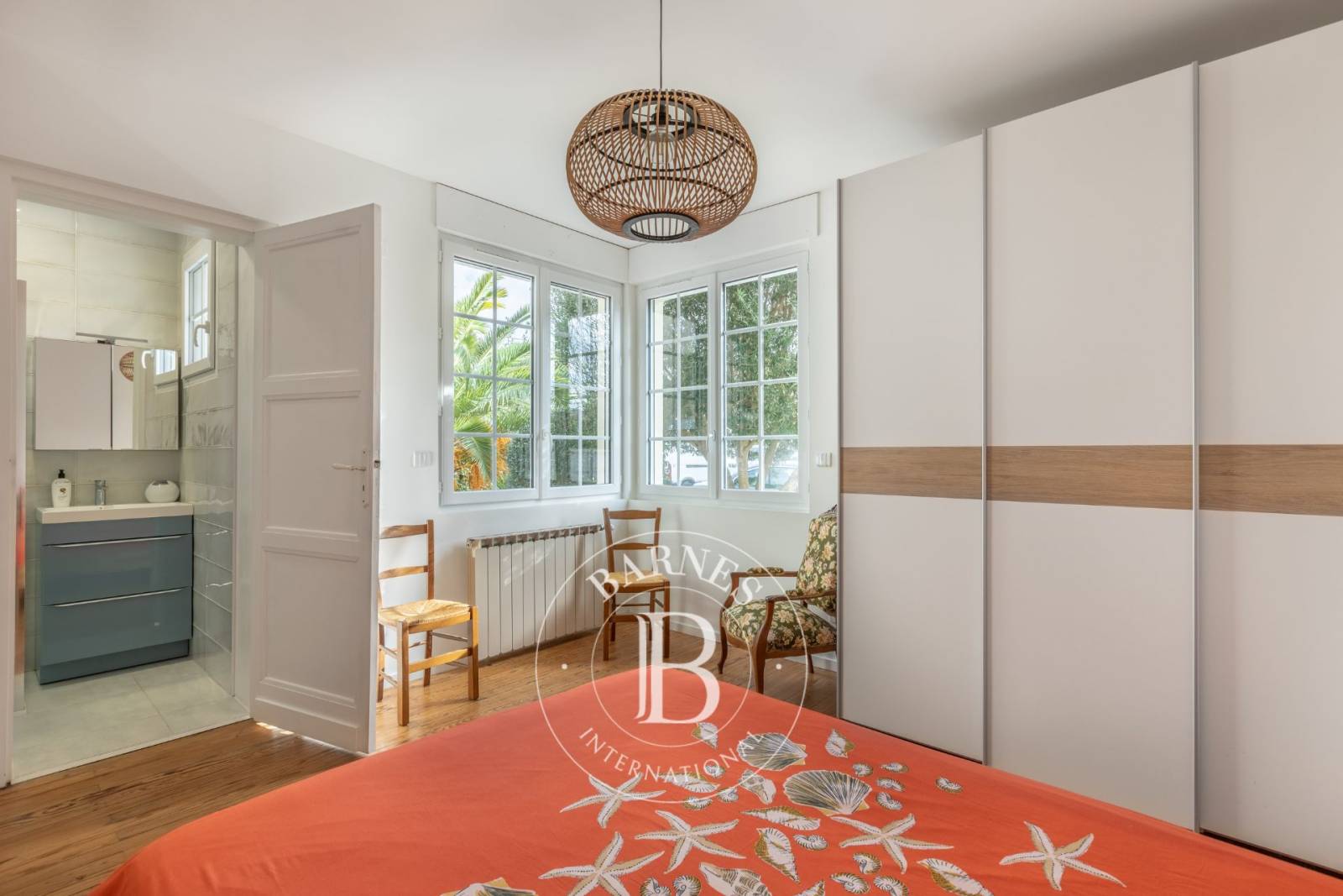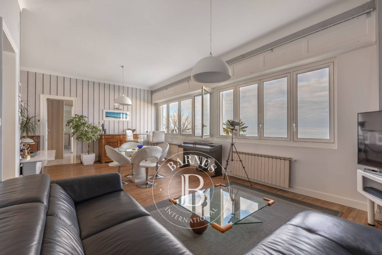 À l'étage, le palier conduit à quatre chambres supplémentaires, une grande salle d'eau, et une seconde pièce de vie offrant une perspective unique sur le Bassin.