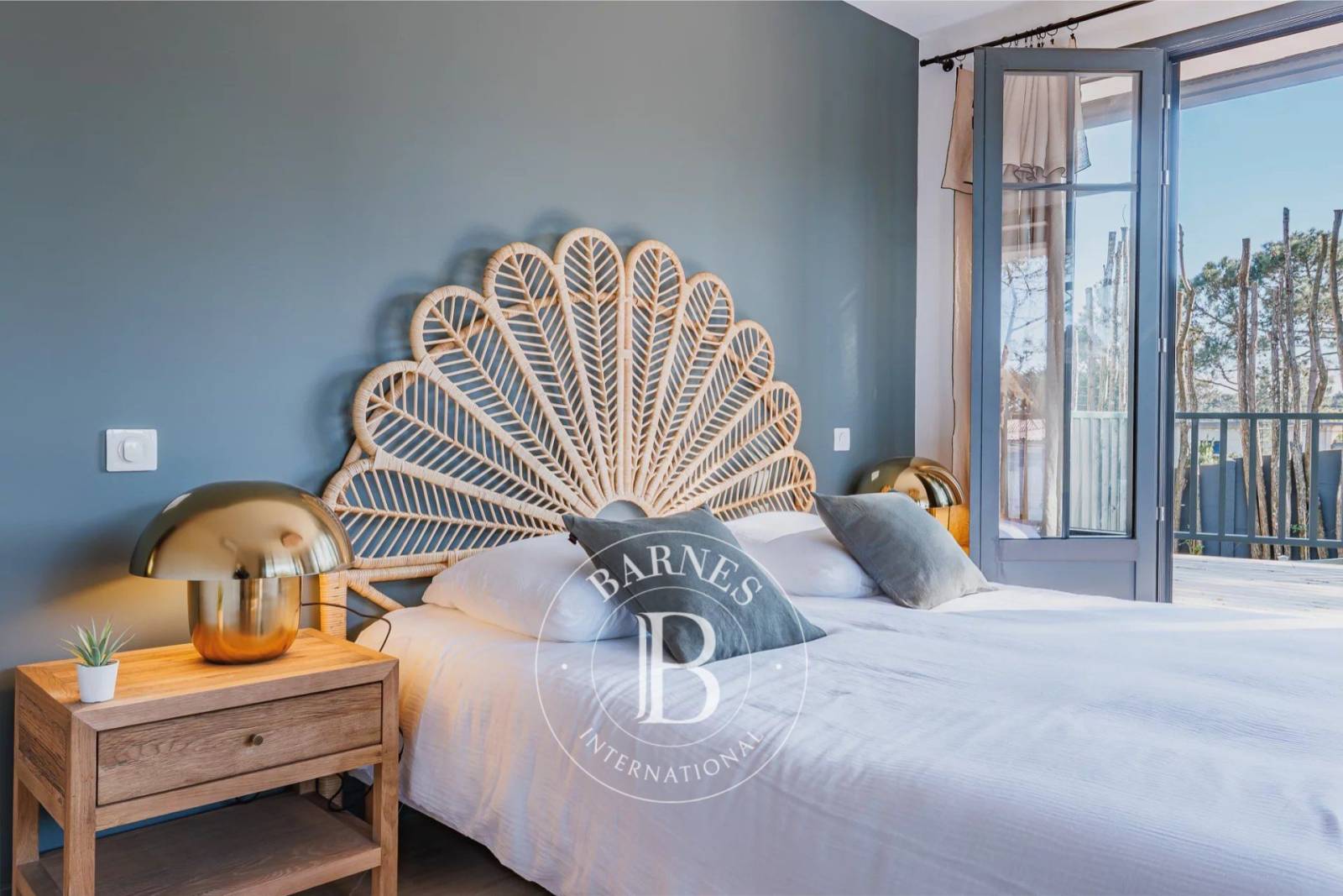 L’extérieur, soigneusement aménagé, comprend une terrasse en position dominante, offrant un cadre préservé pour profiter du soleil à l’abri des regards. La piscine complète cet espace, véritable invitation à la détente au cœur du Cap Ferret.