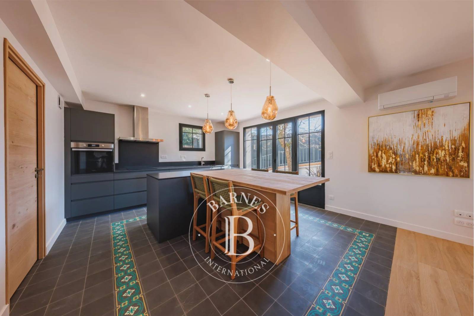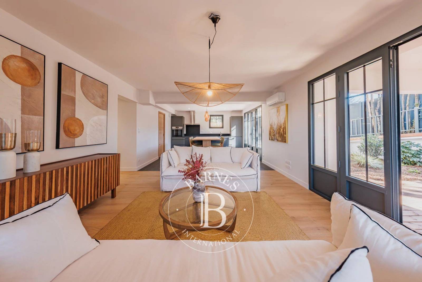 D’une surface de plus de 200 m², cette villa s’ouvre sur une pièce de vie lumineuse, où le salon et la salle à manger profitent d’une vue dégagée sur la piscine. L’espace cuisine, entièrement équipé, intègre un îlot dinatoire et un cellier attenant, apportant confort et fonctionnalité.