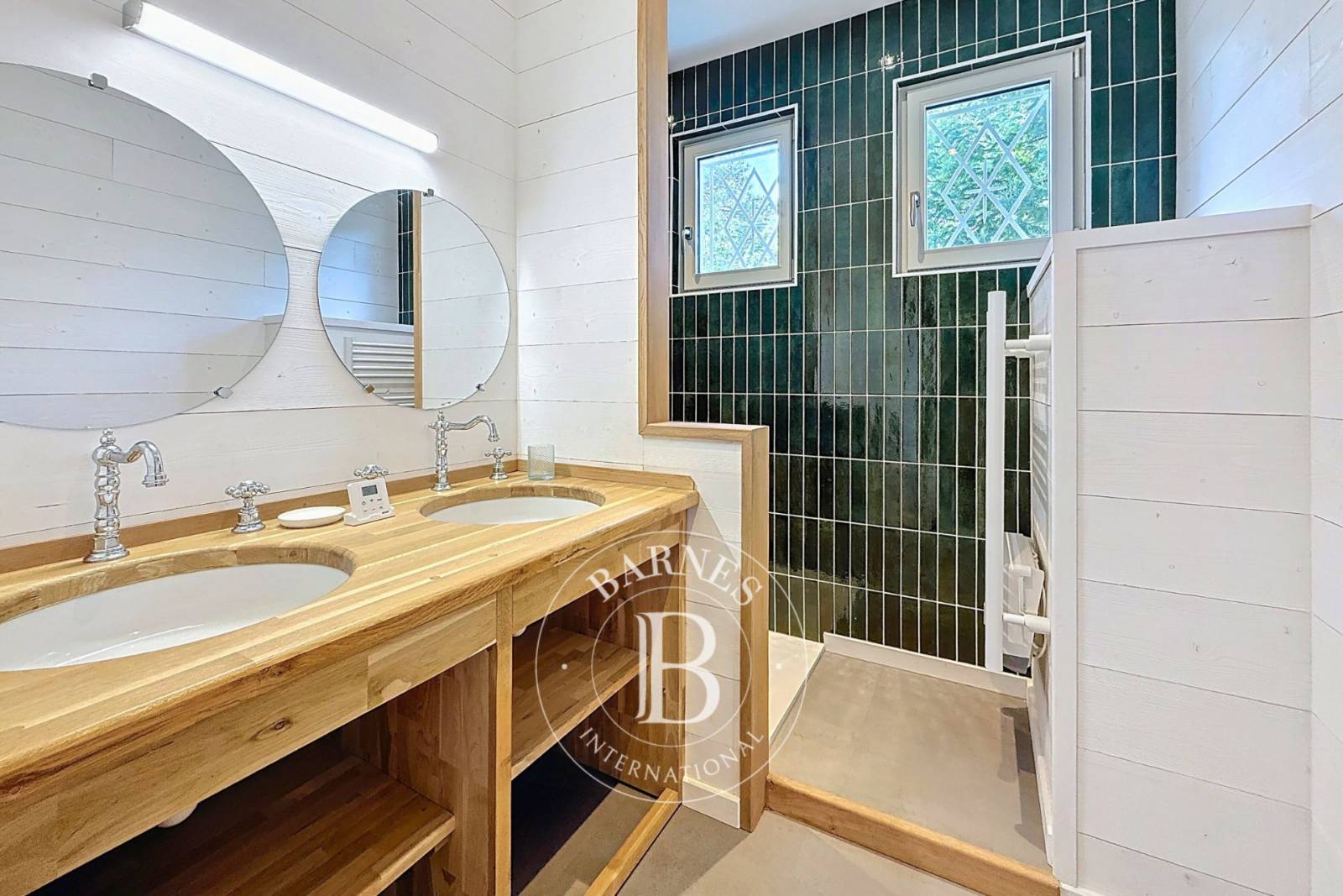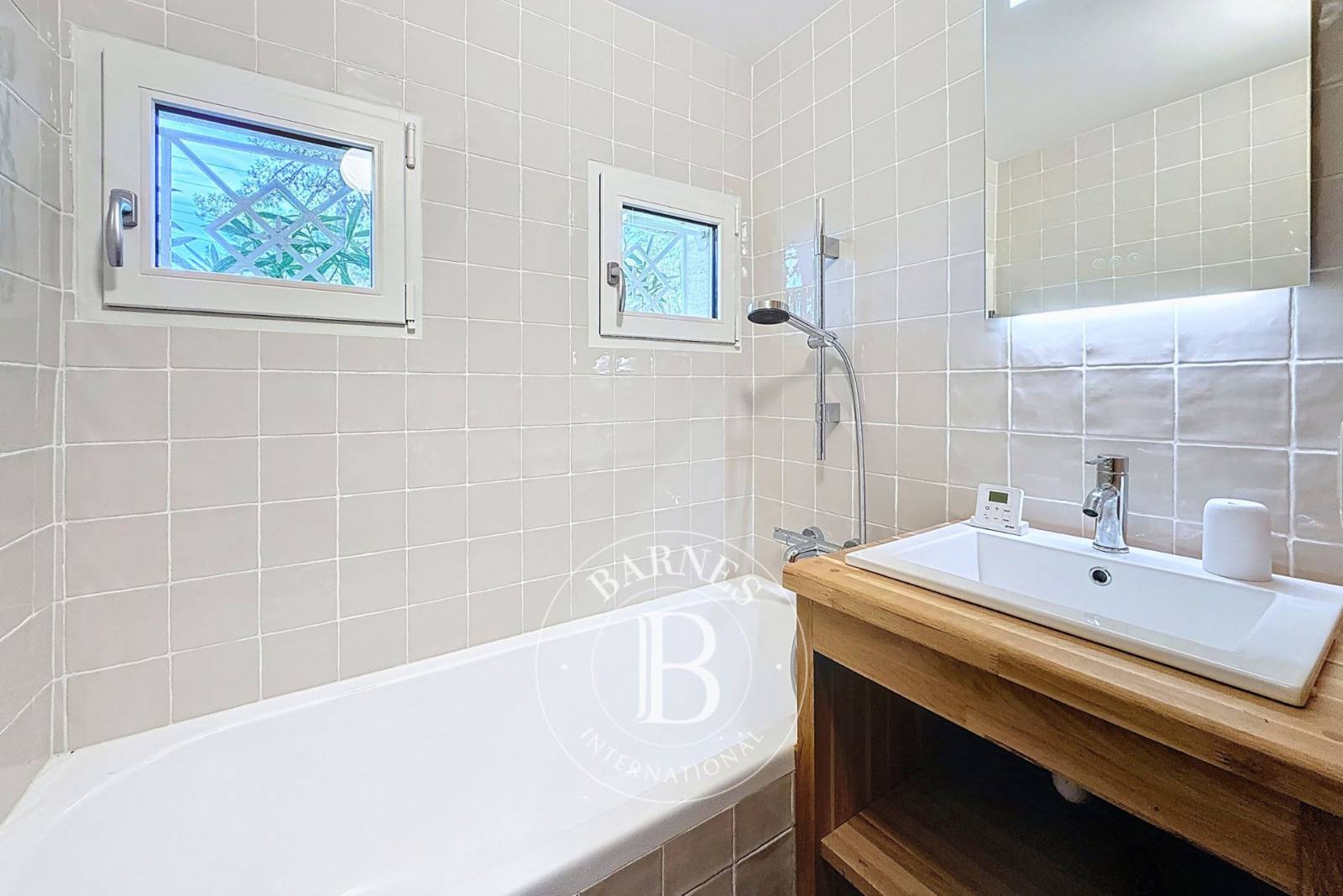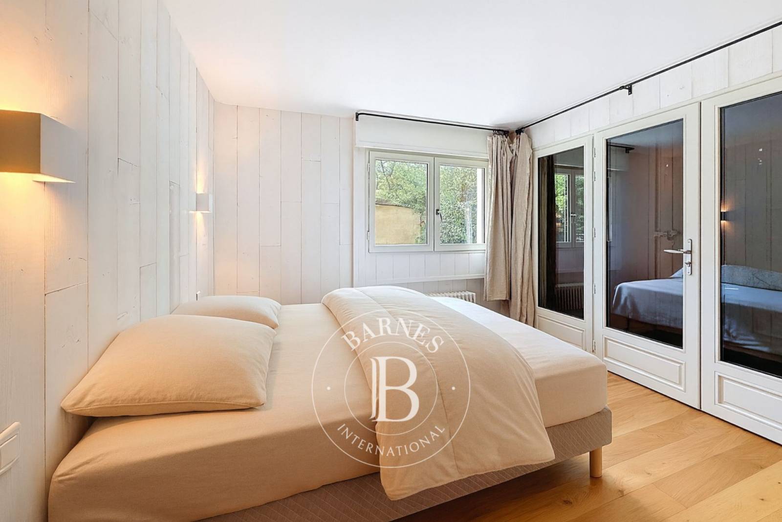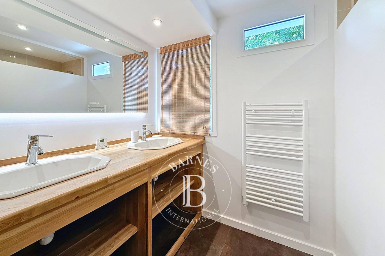 Répartie sur deux niveaux, elle propose en rez-de-jardin quatre chambres, deux salles d’eau, une salle de bains, des toilettes séparés et une buanderie. Ces espaces s’ouvrent sur la terrasse et la piscine.