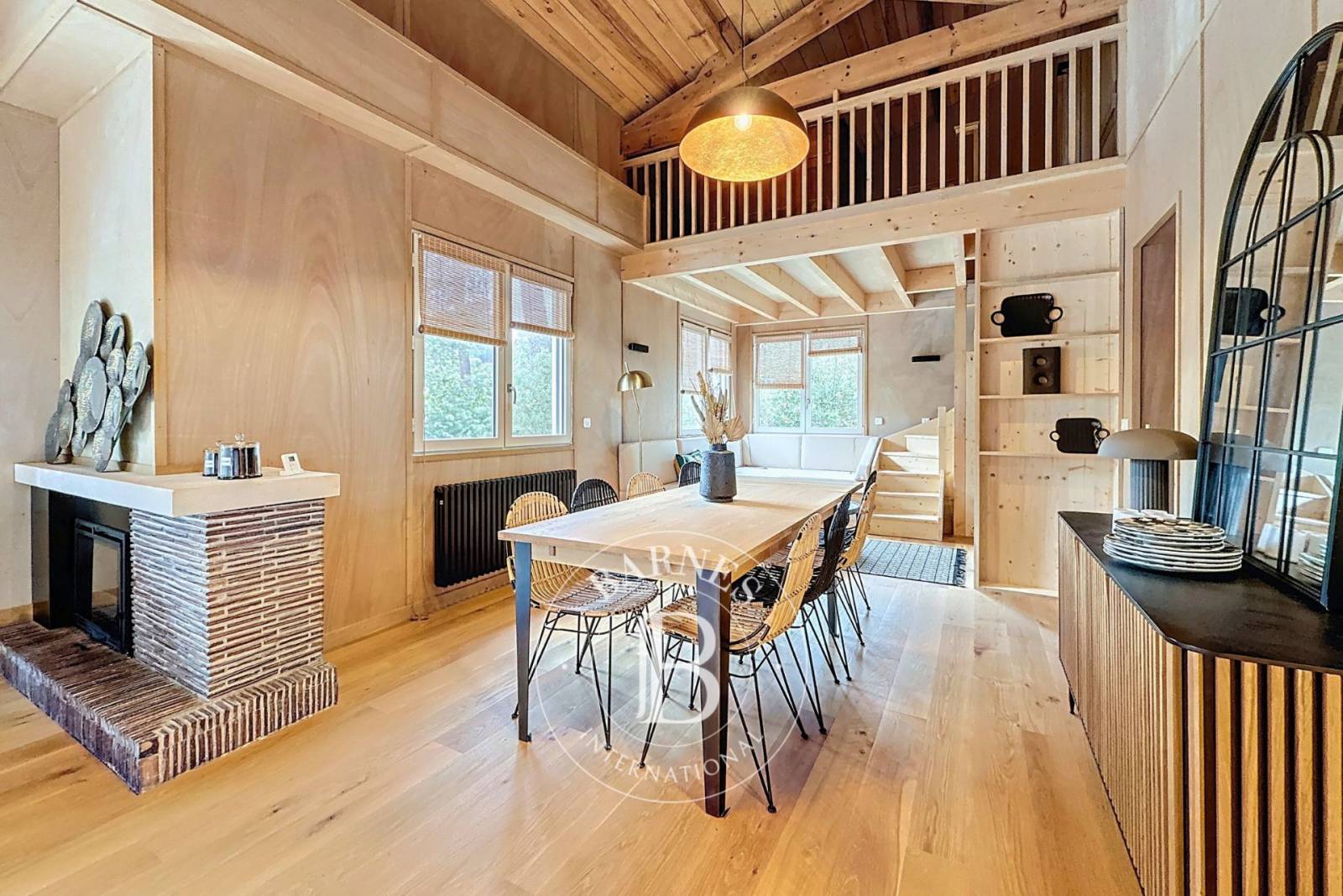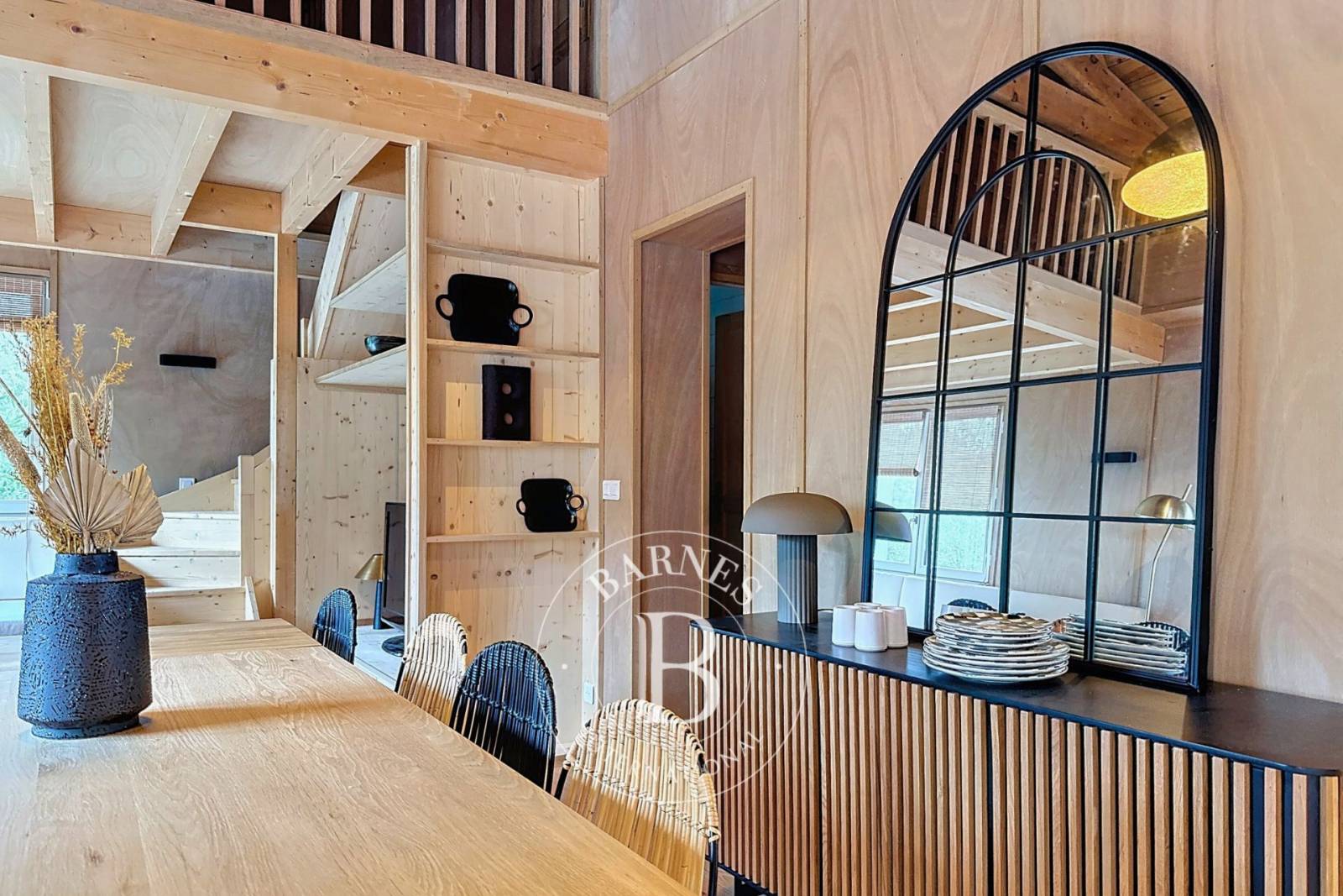 À l’étage, la pièce de vie séduit par sa belle hauteur sous plafond, sa charpente apparente et la chaleur du bois qui y prédomine. Le salon avec cheminée, le coin télévision et la mezzanine pouvant accueillir un bureau créent un espace convivial. La cuisine séparée, entièrement équipée, jouxte l’entrée avec placard et s’ouvre sur une terrasse en enfilade. Ce niveau accueille également une chambre parentale avec sa salle d’eau privative.