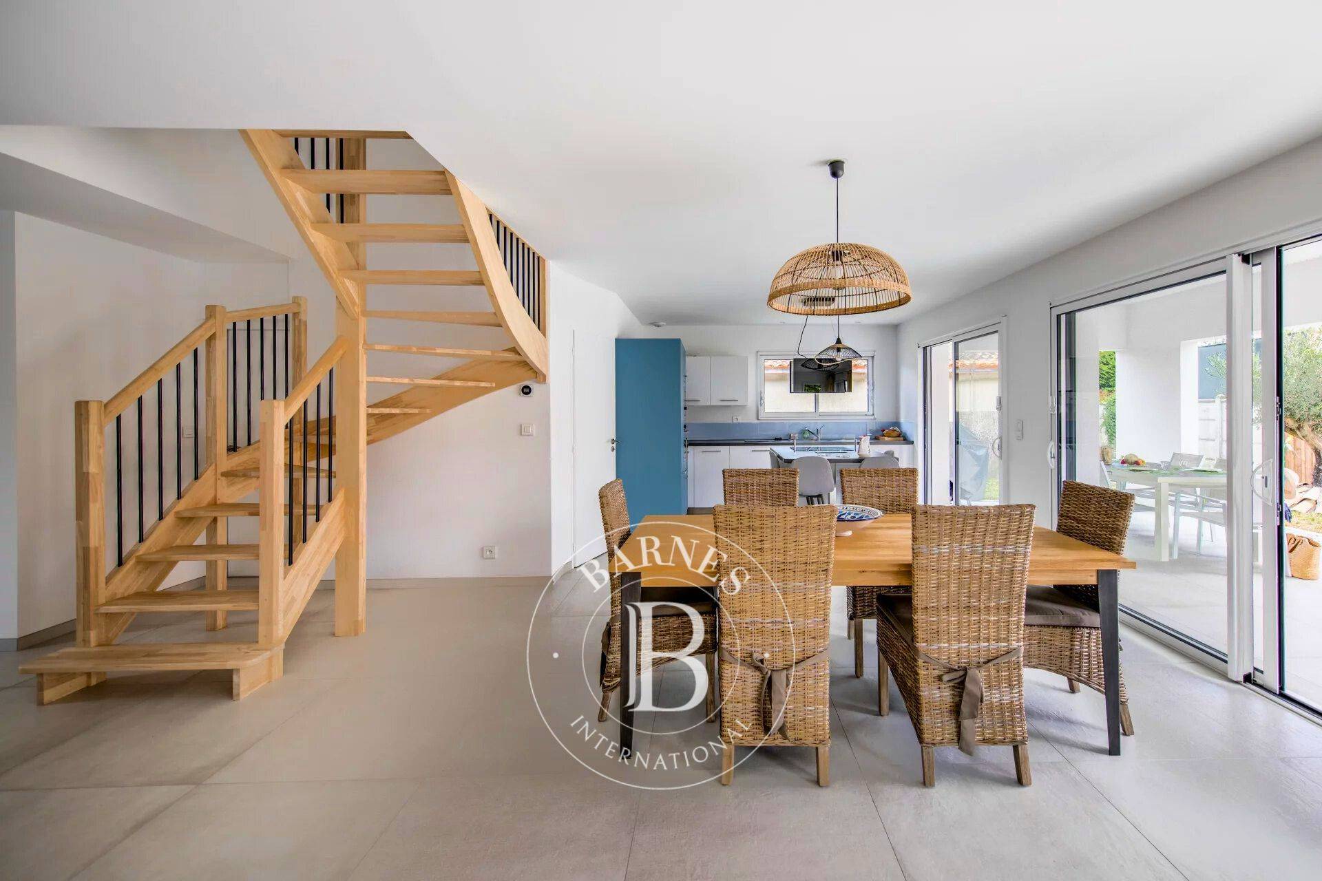 La villa dispose de quatre chambres, dont une suite complète au rez-de-chaussée, avec salle d’eau privative. À l’étage, les autres chambres et une salle de bains offrent un confort optimal. Un bureau complète cet ensemble, idéal pour un espace de travail ou de loisirs.